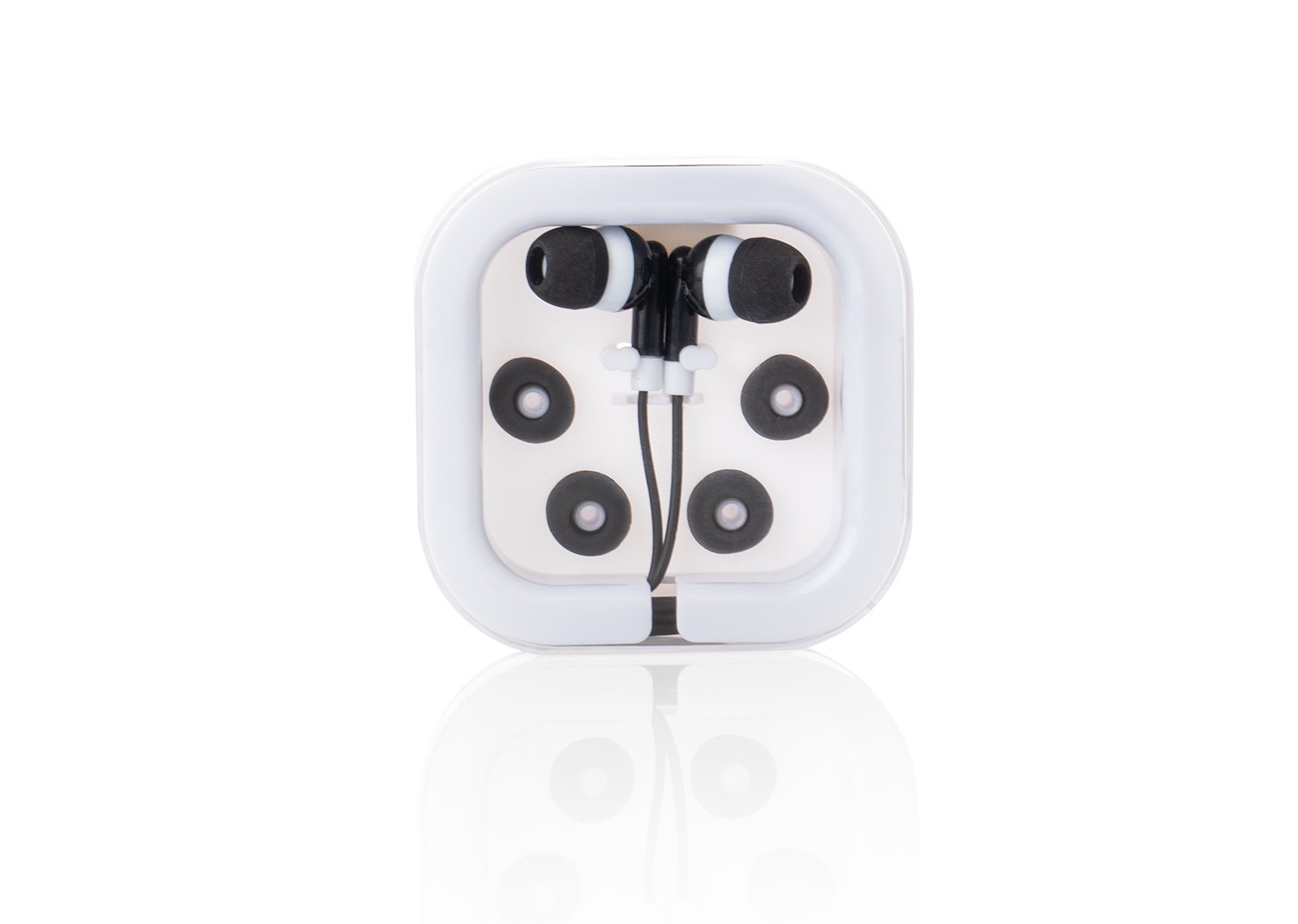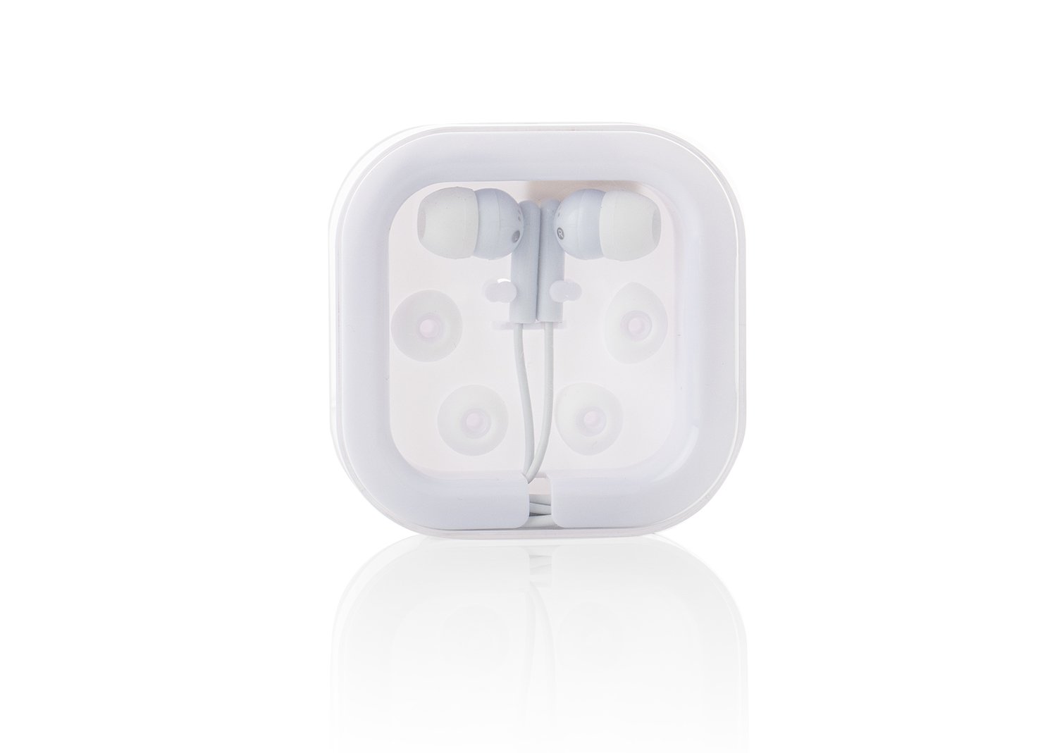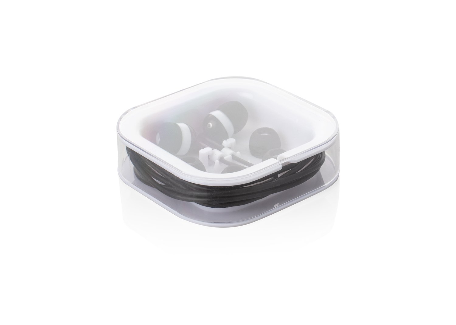 Audífonos con entrada tipo C en estuche cuadrado transparente a presión.