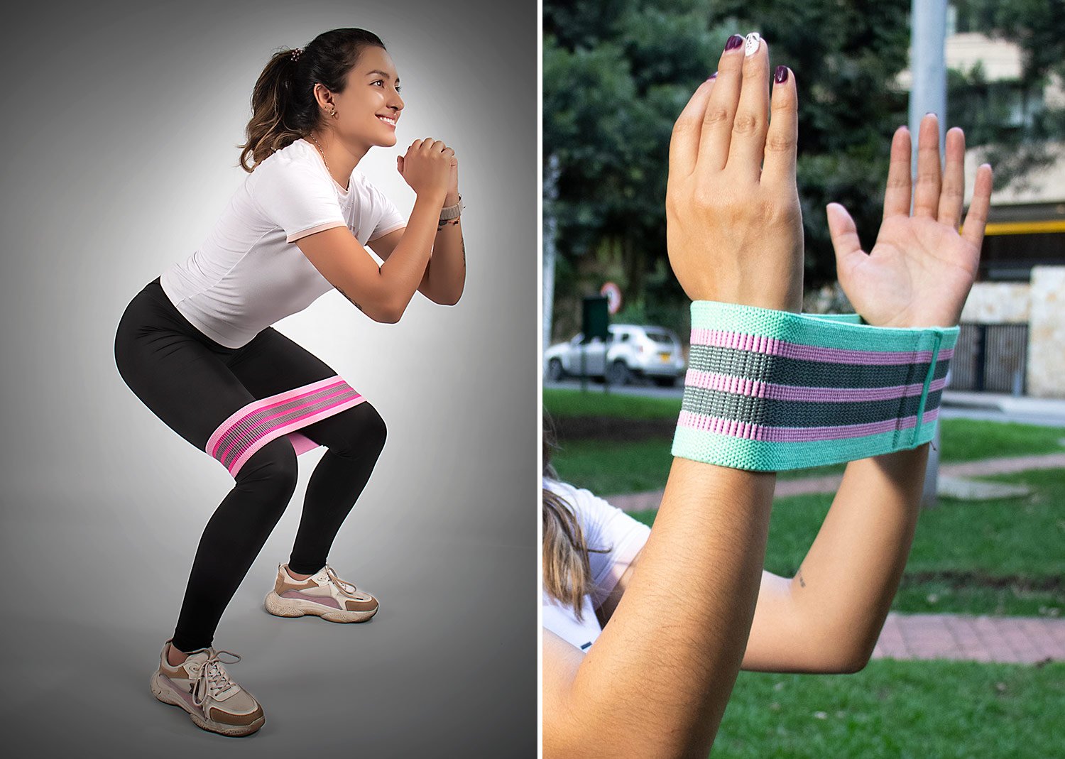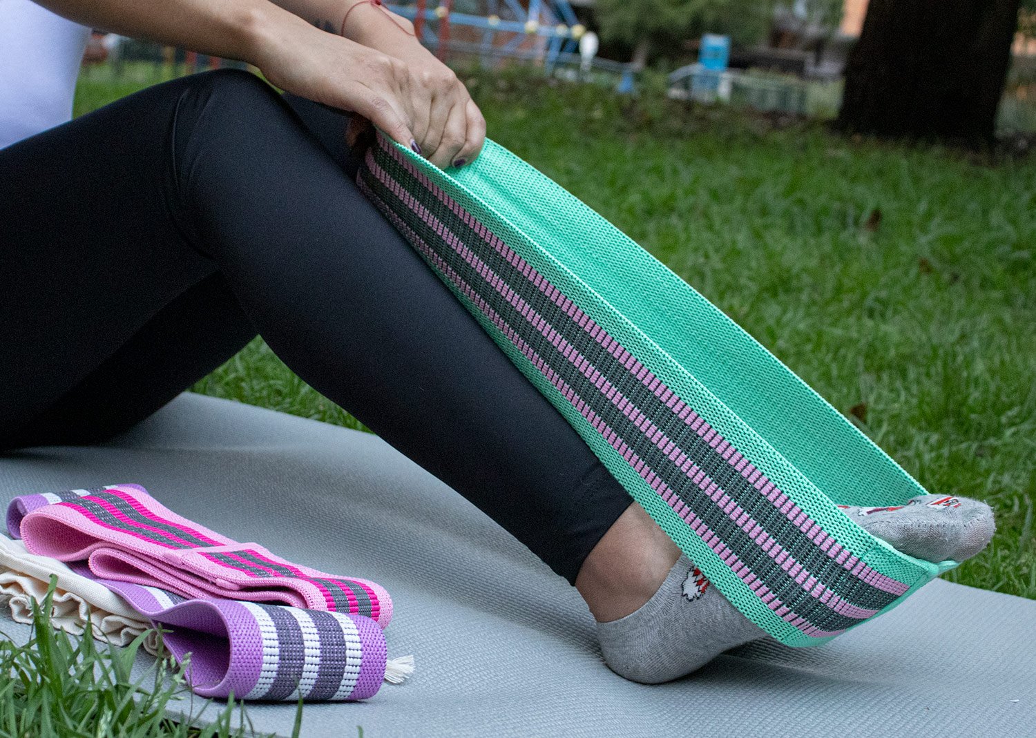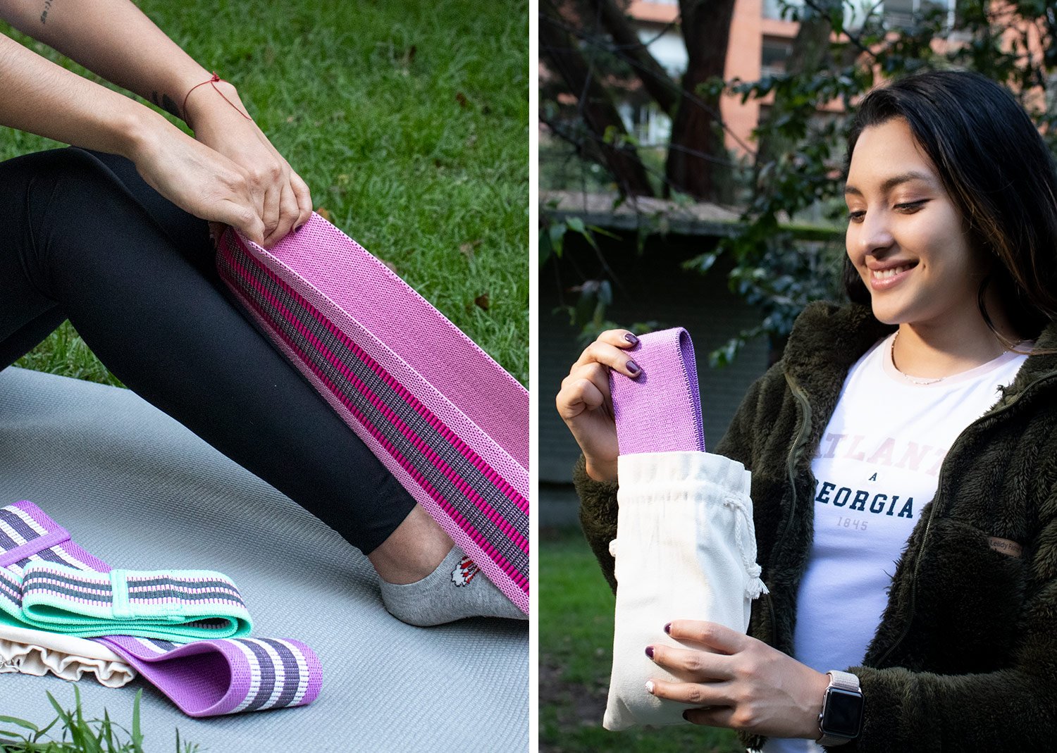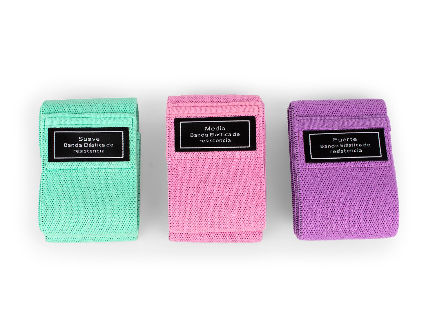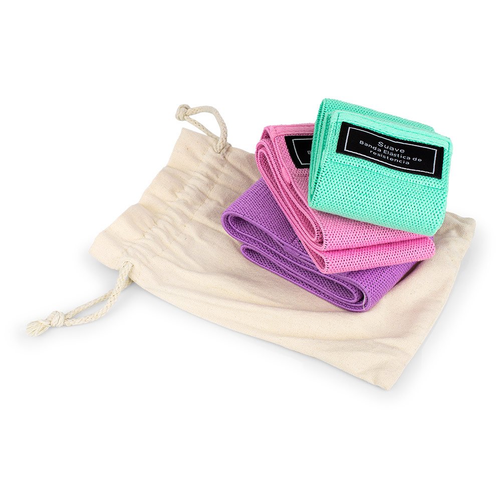 Set de 3 Bandas elásticas deportivas para trabajo funcional, en estuche algodon. Tres resistencias: Suave, Medio y Fuerte