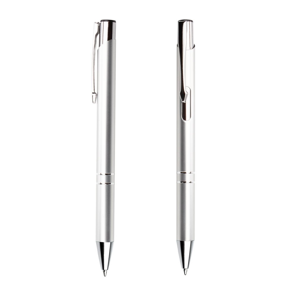 Bolígrafo con sistema de apertura retráctil y clip metálico.