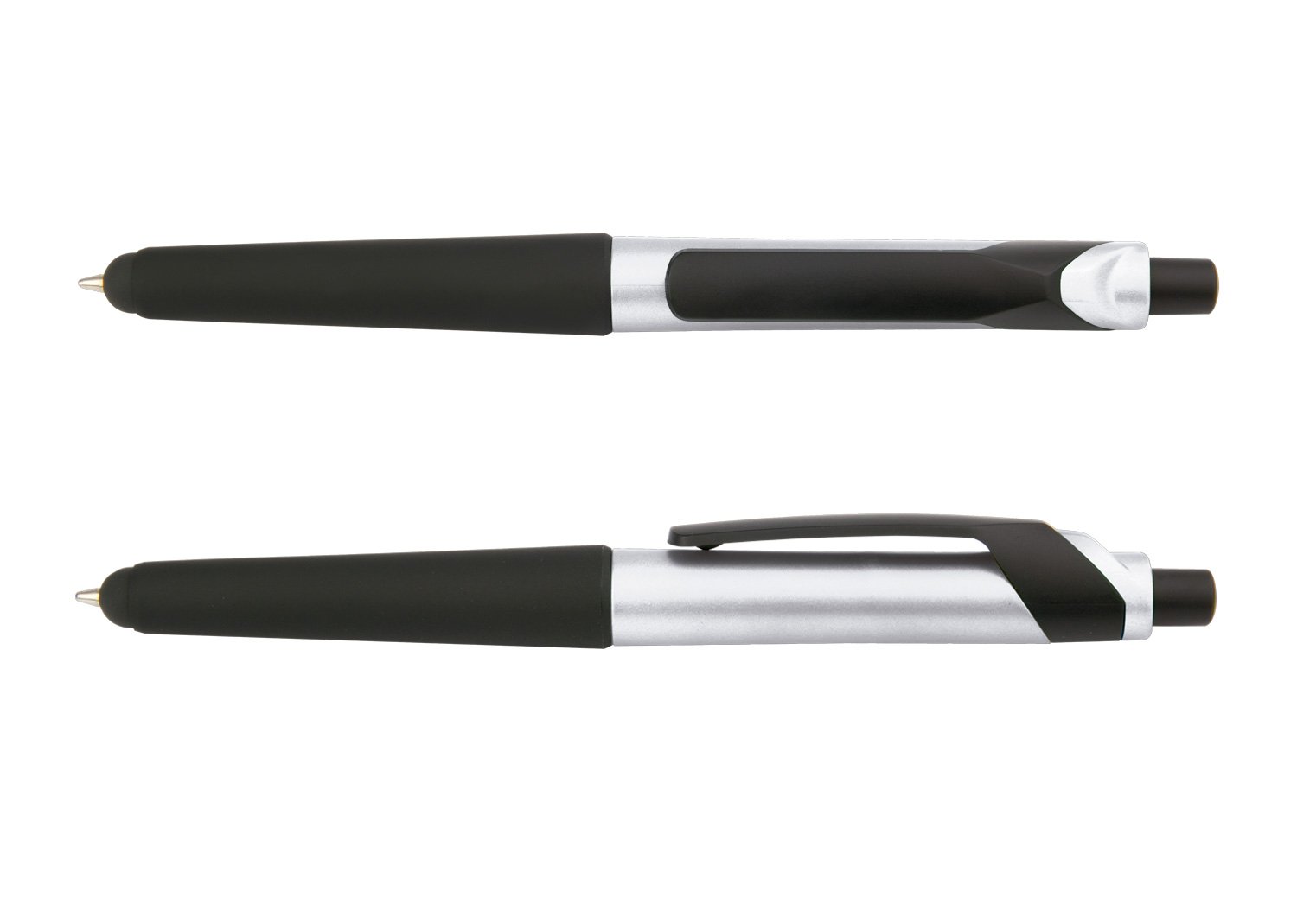 Bolígrafo plástico con sistema de apertura retráctil y Touch para dispositivos con pantallas táctiles. Recubrimiento antideslizante en la punta.