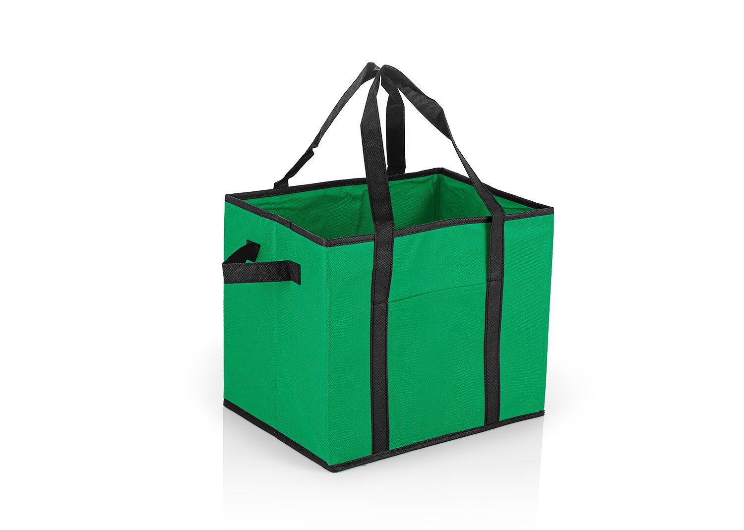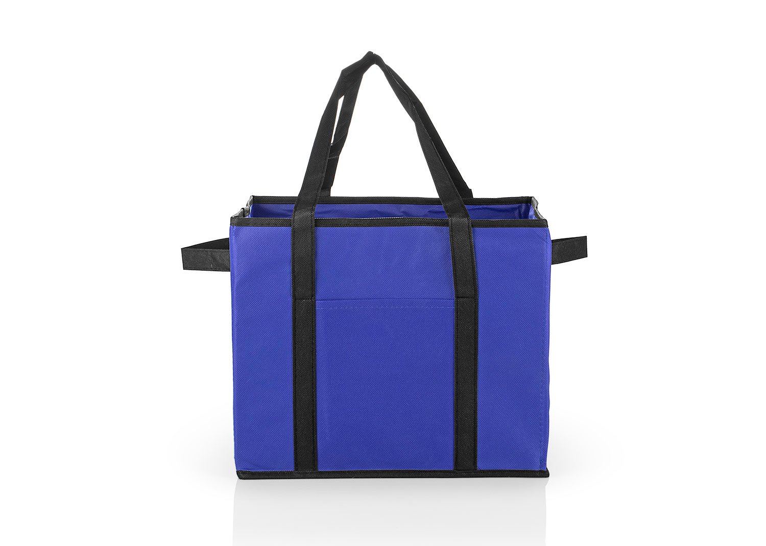 Bolsa ecológica con base rígida en el fondo, bolsillo frontal, doble agarradera lateral y manijas, ideal y cómoda para compras de gran volumen.