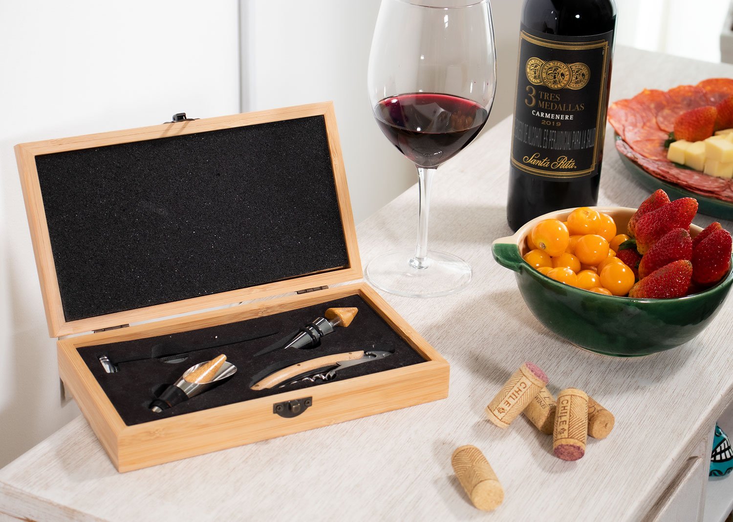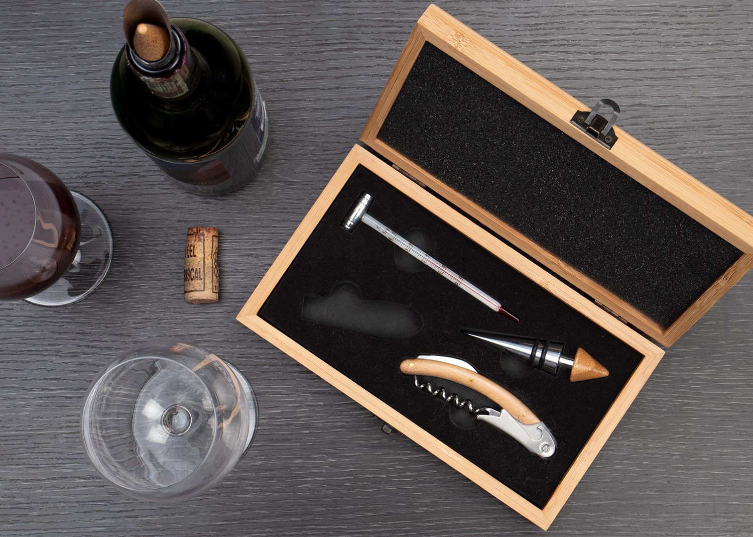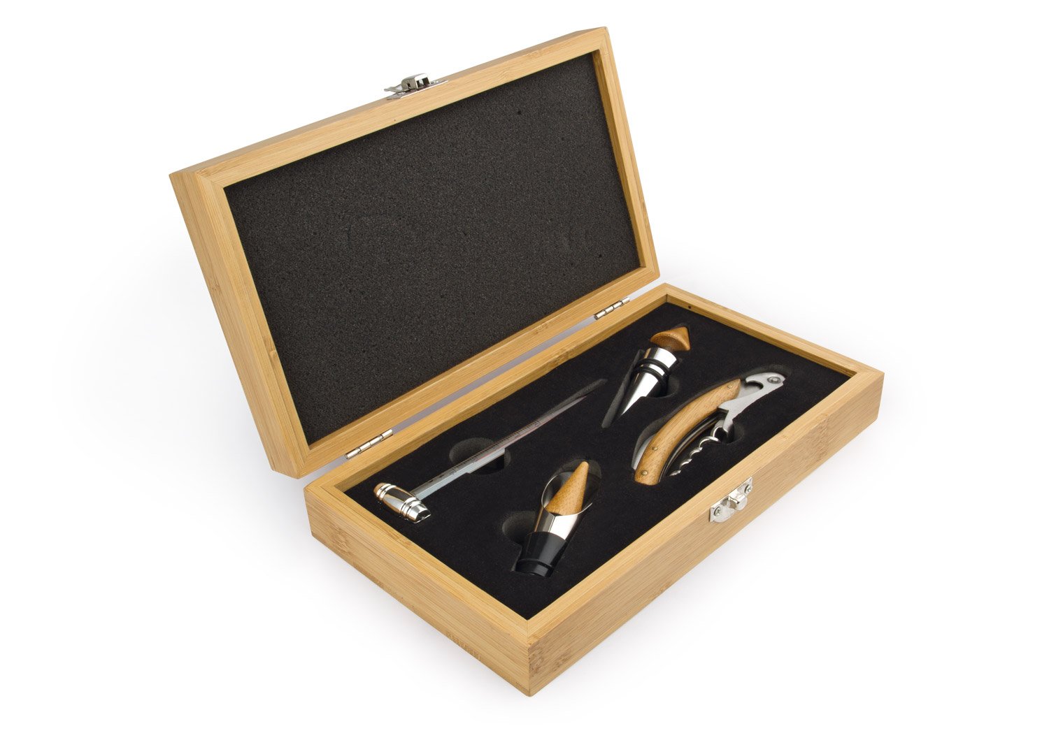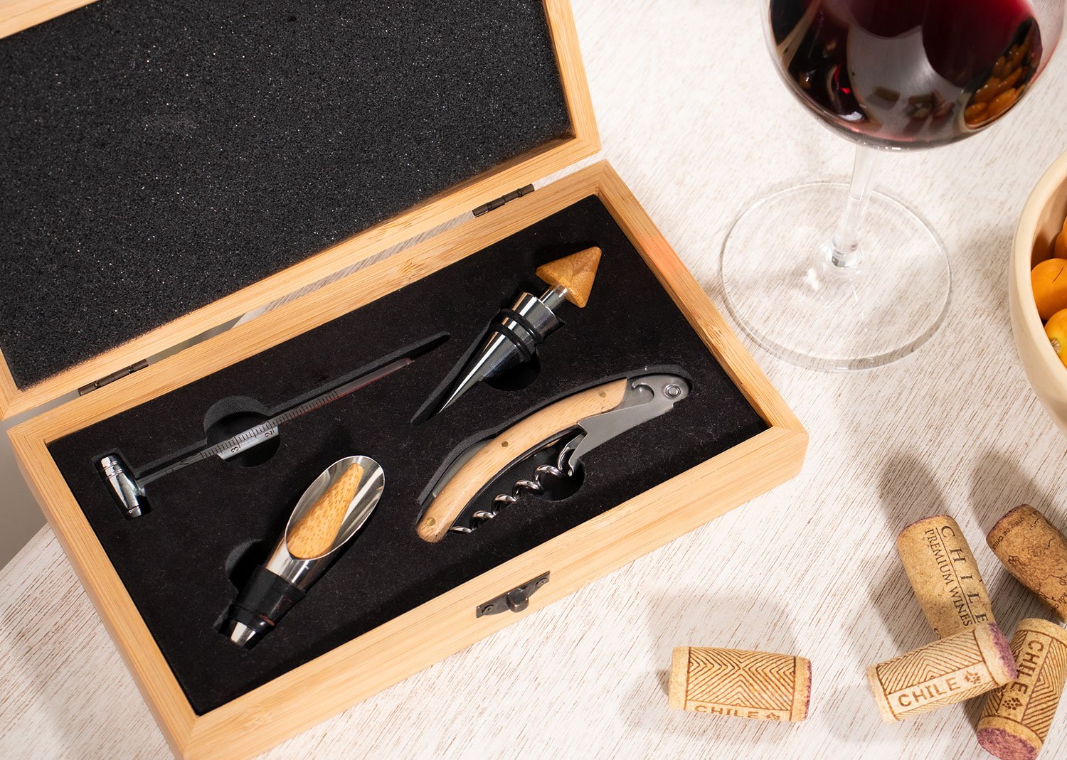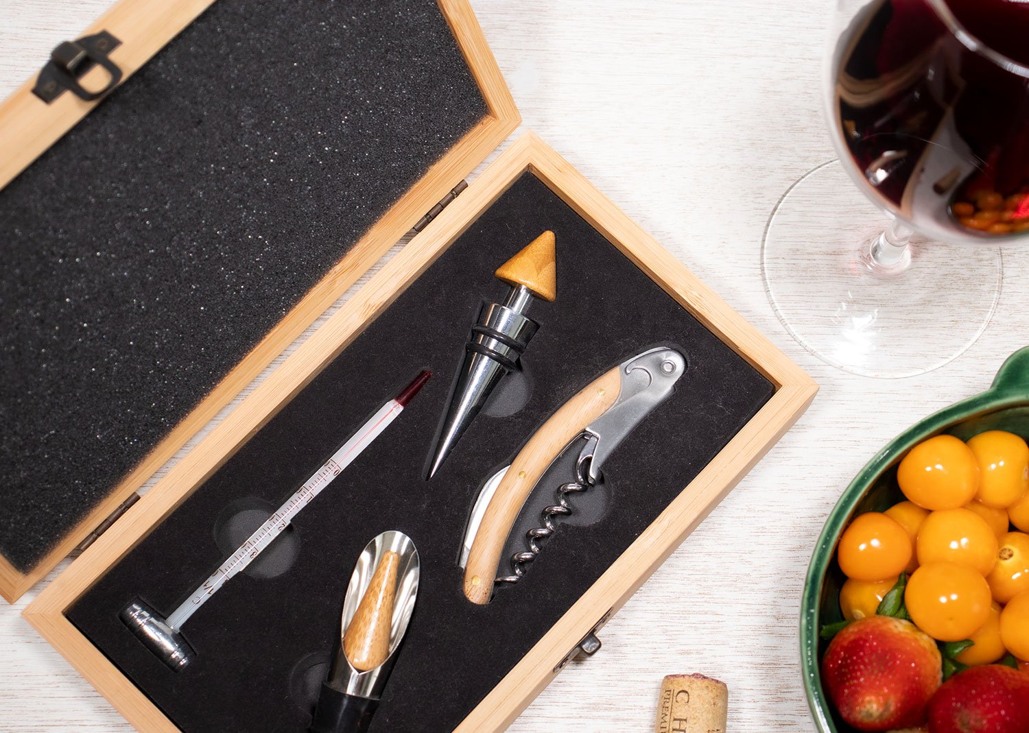 Contiene 4 accesorios con apliques en madera: Tapón para botella, sacacorchos descapsulador de 1 tiempo, termómetro y cortagotas.