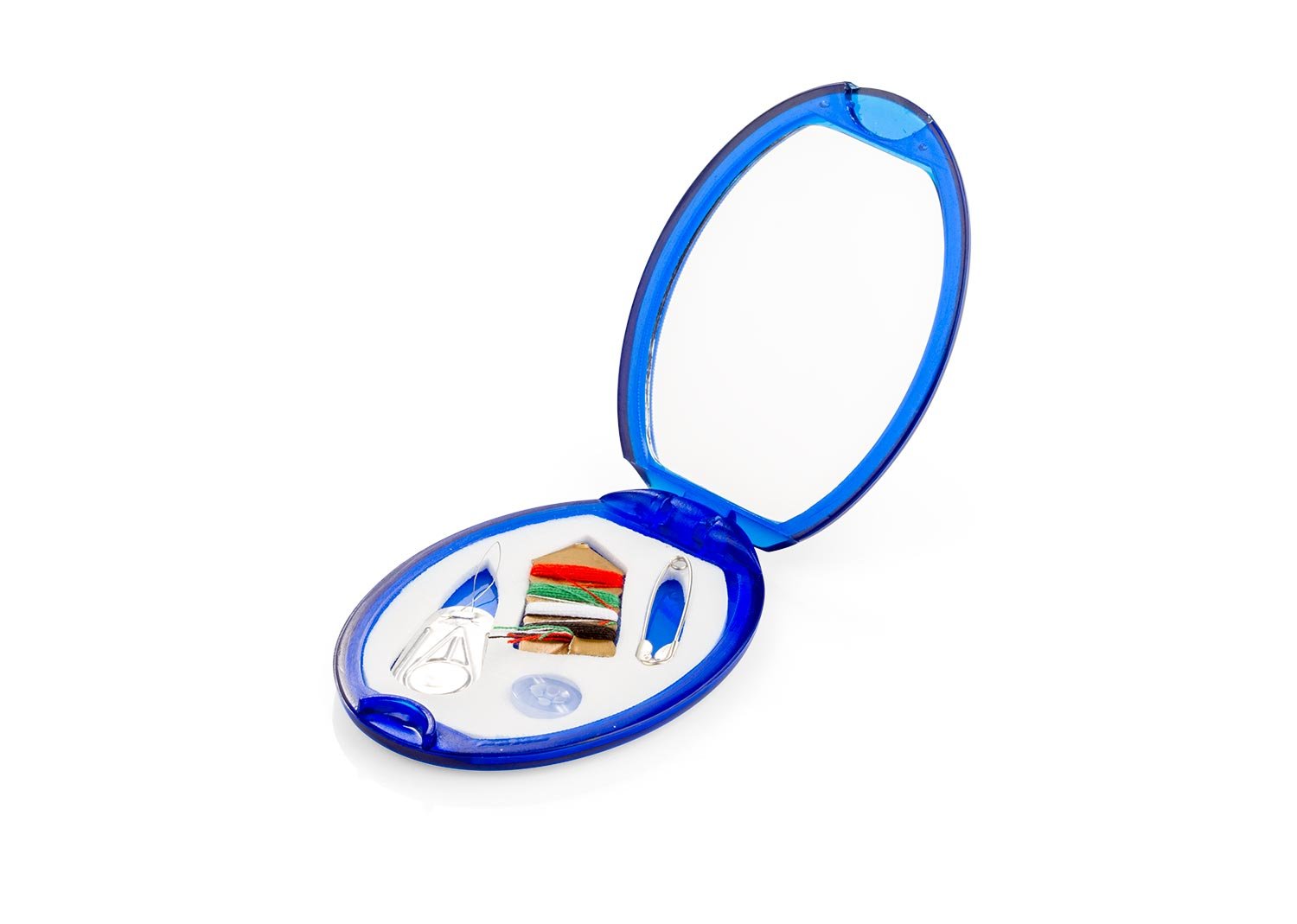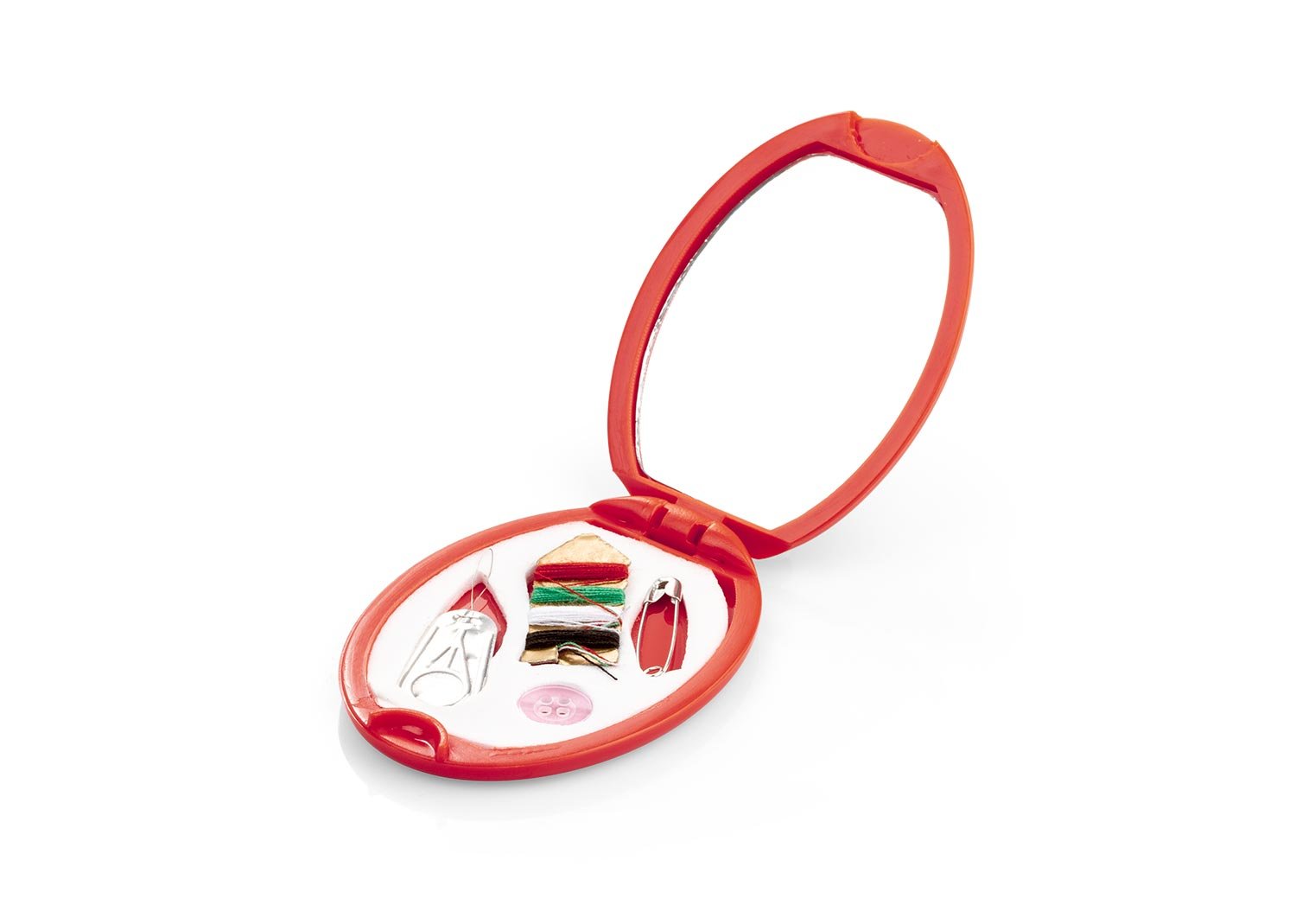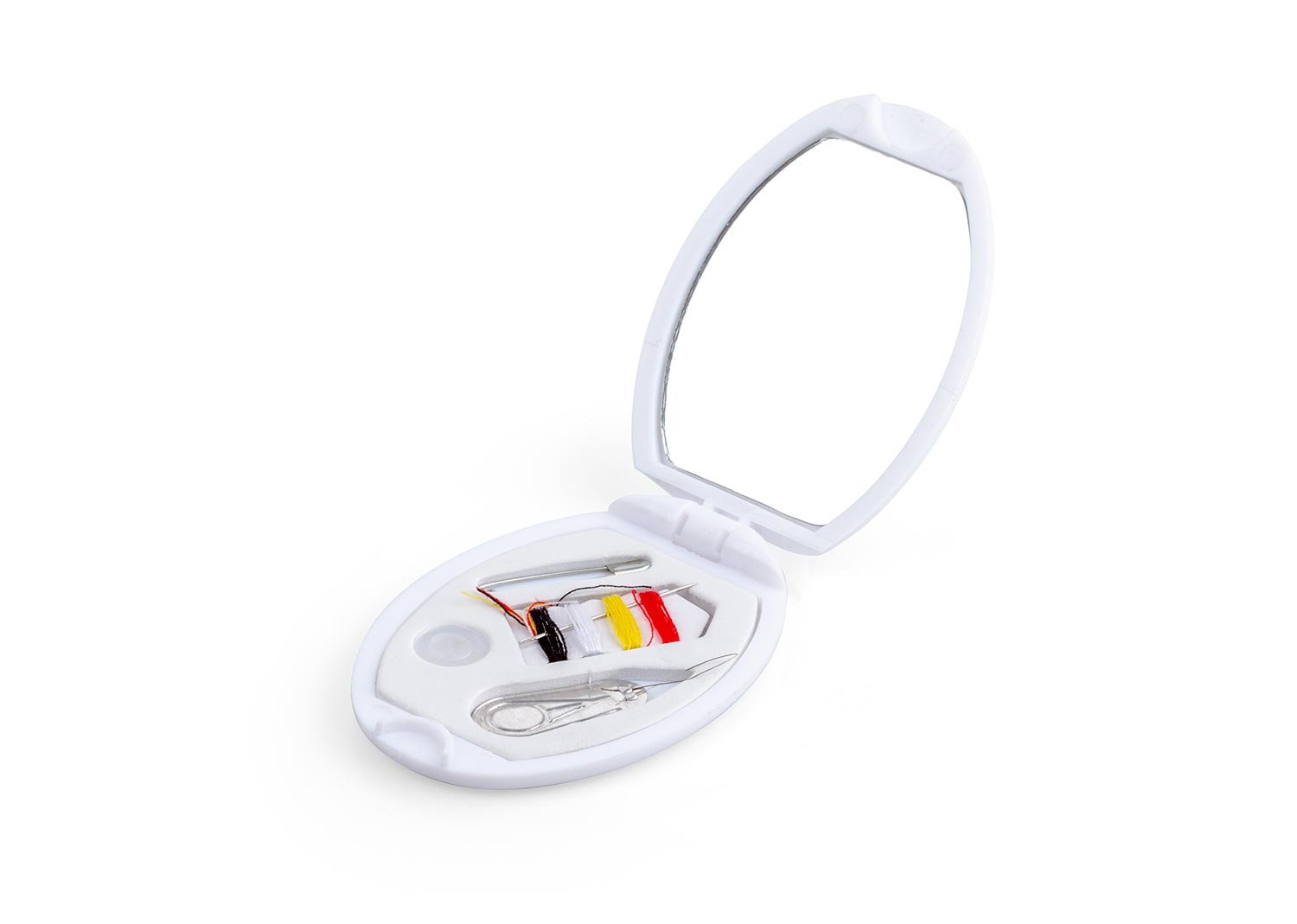 Minicosturero con espejo. Incluye hilos de colores, aguja, gancho nodriza, enhebrador y botón.