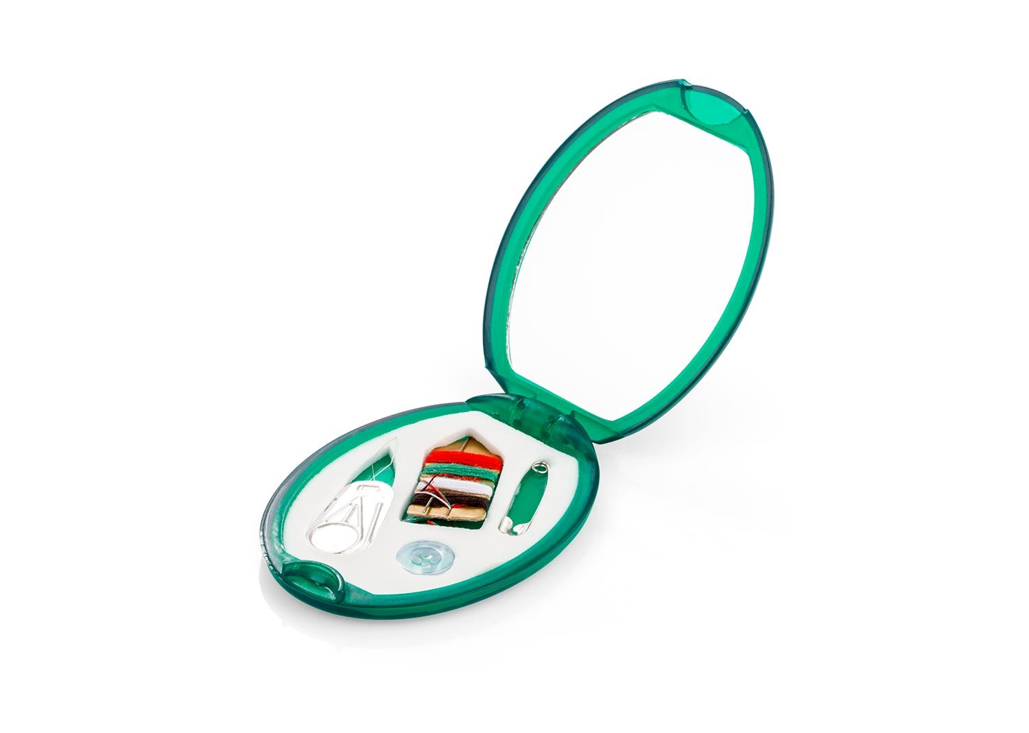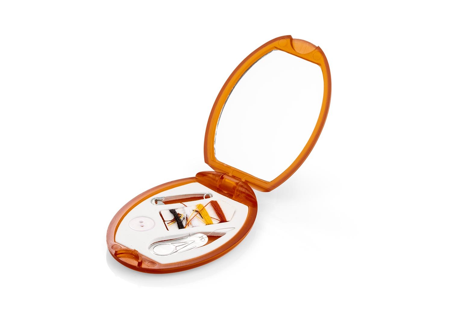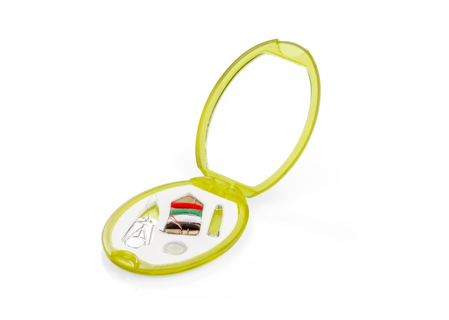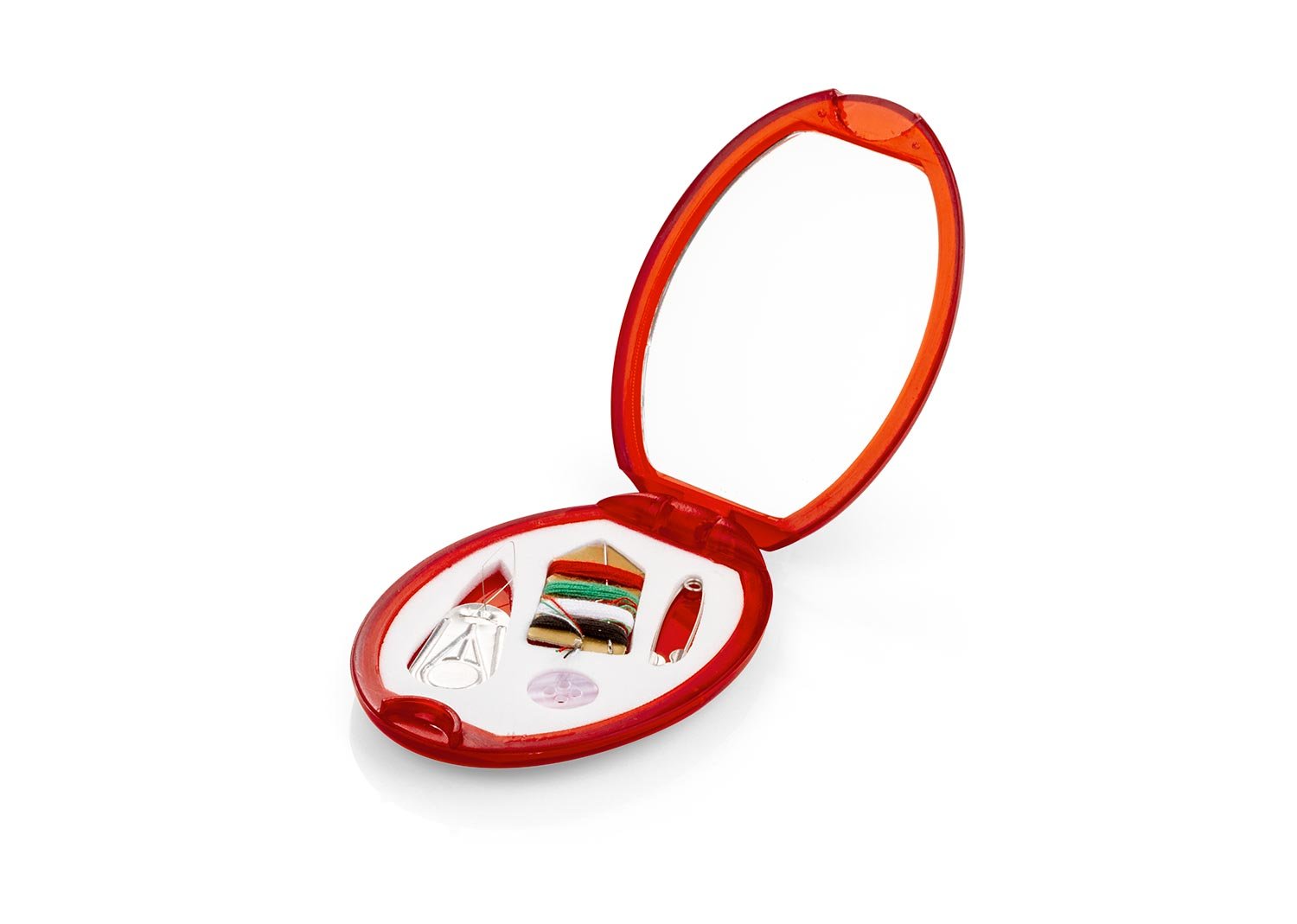 Minicosturero con espejo. Incluye hilos de colores, aguja, gancho nodriza, enhebrador y botón.