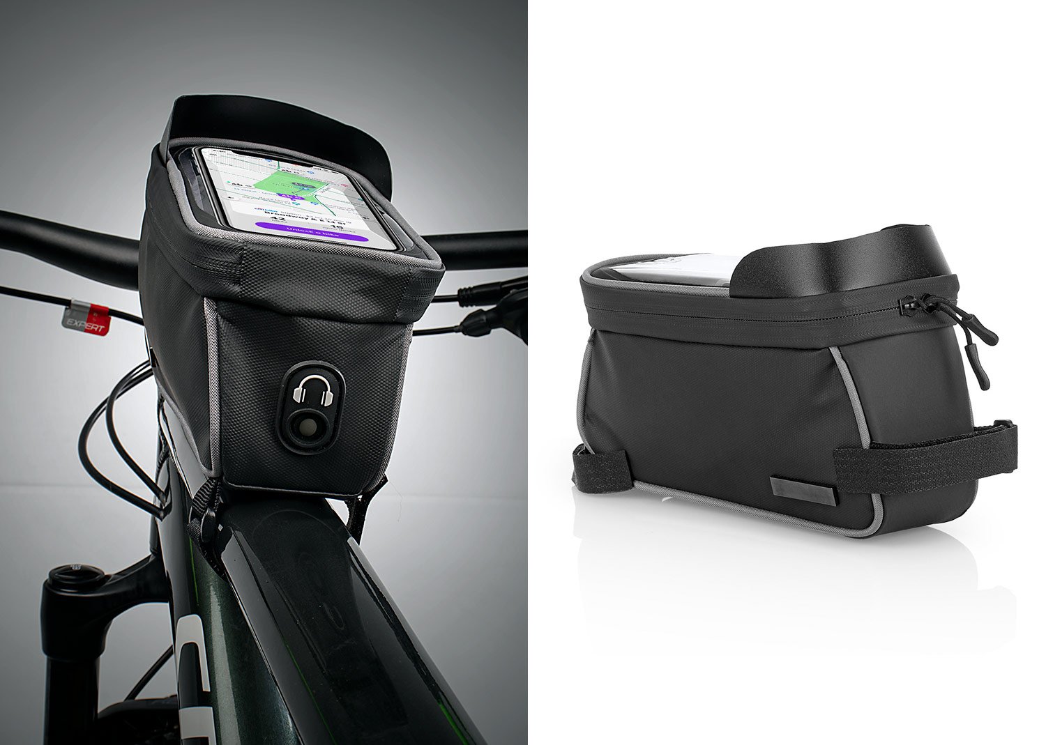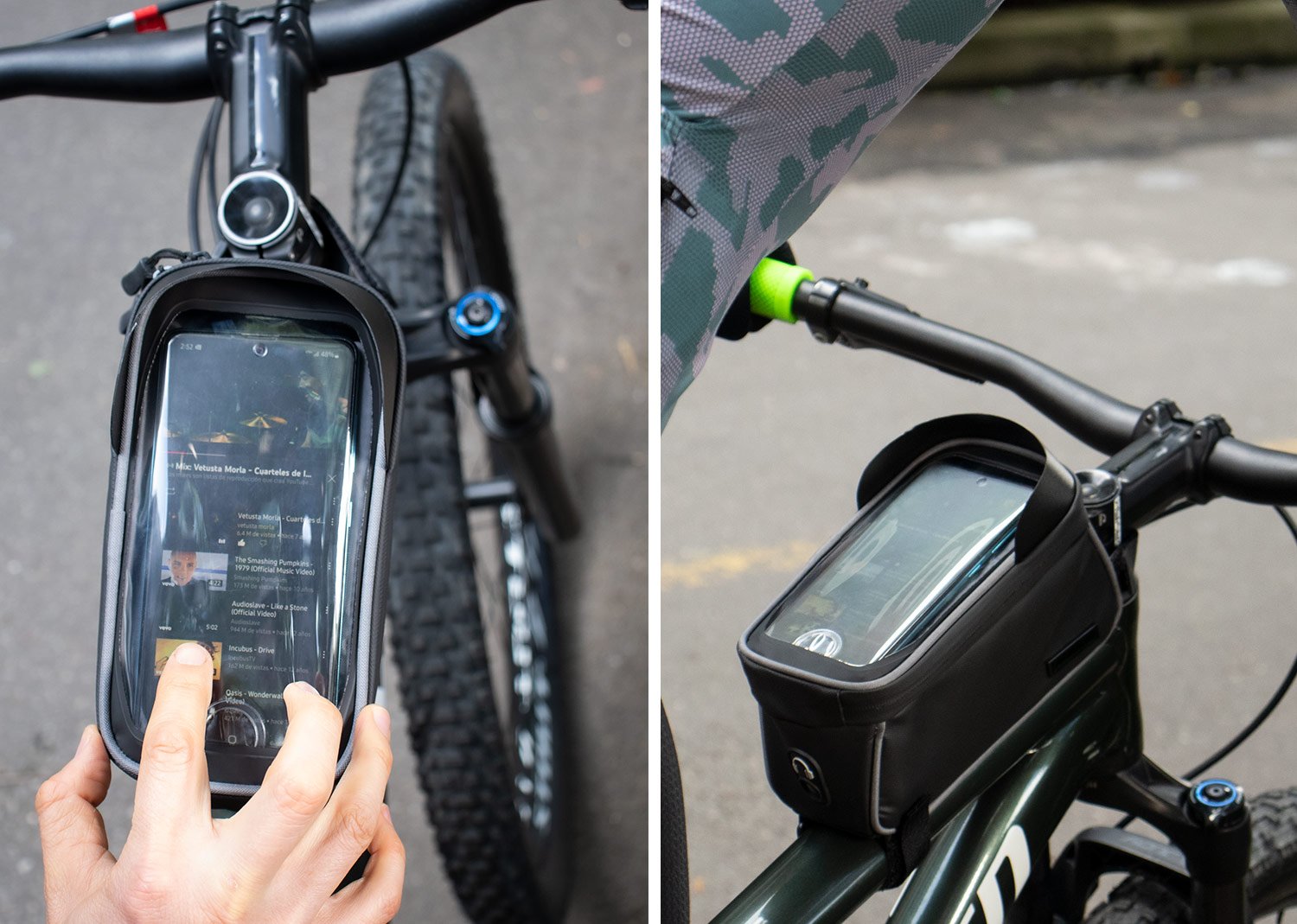 Estuche impermeable para bicicleta, bolsilo transparente para ubicar el celular de 5,8″, (permite manipular el celular sin que se moje). Doble cremallera, orificio ideal para audífonos, Incluye placa metálica para marca láser.