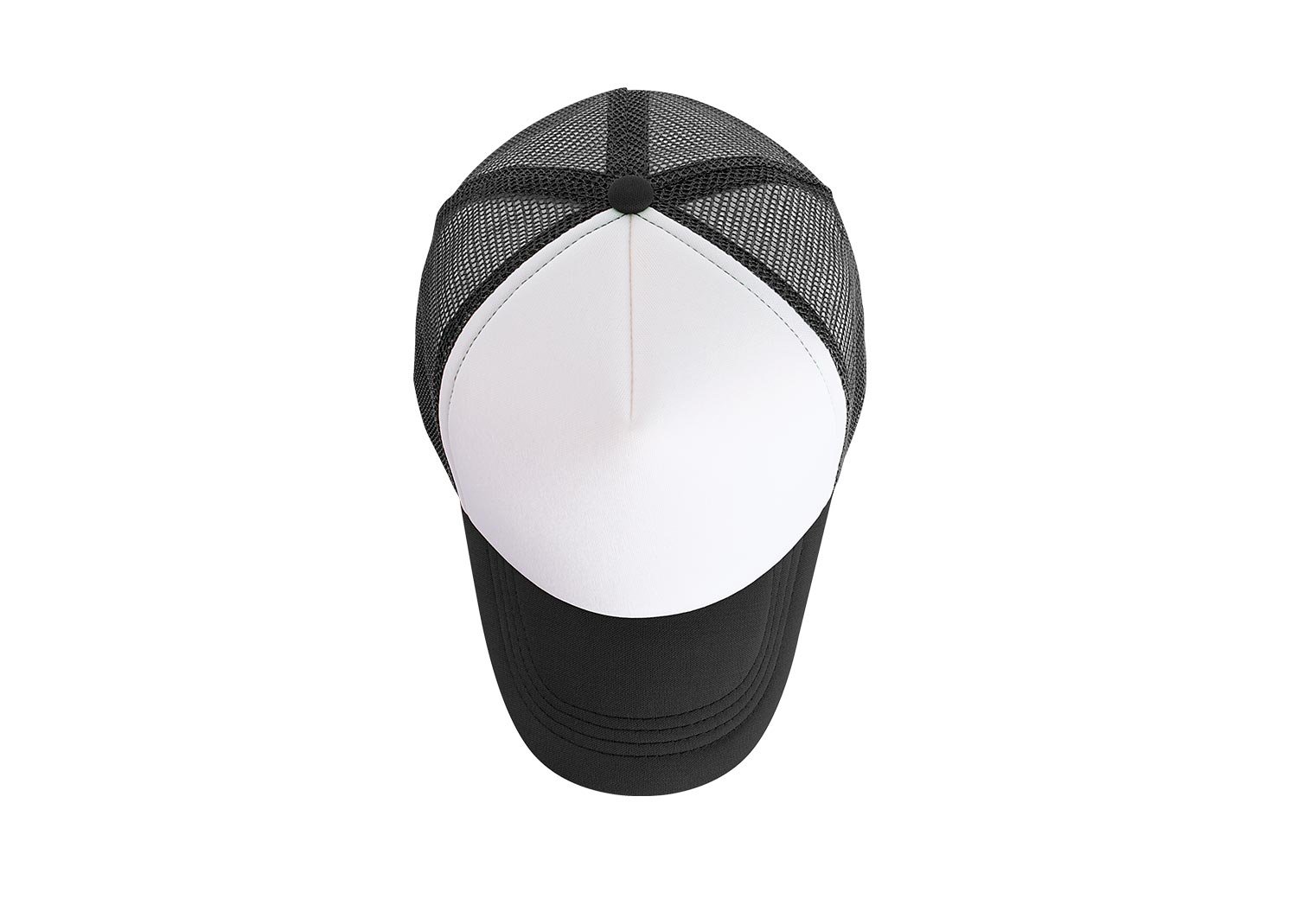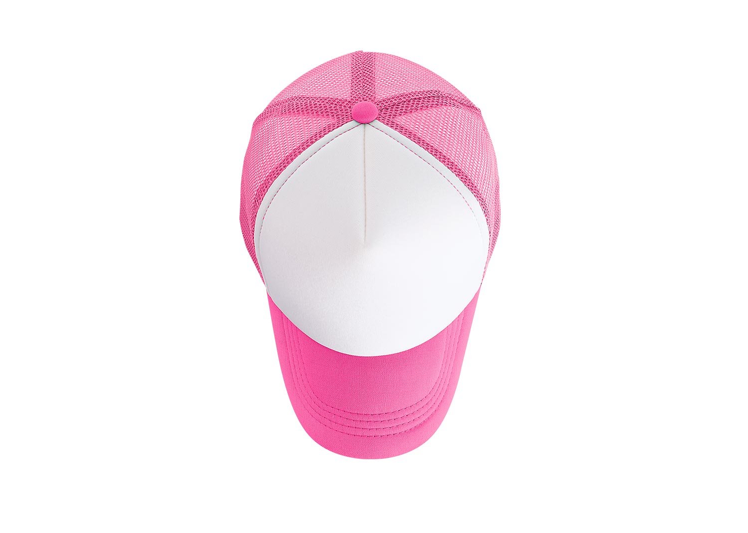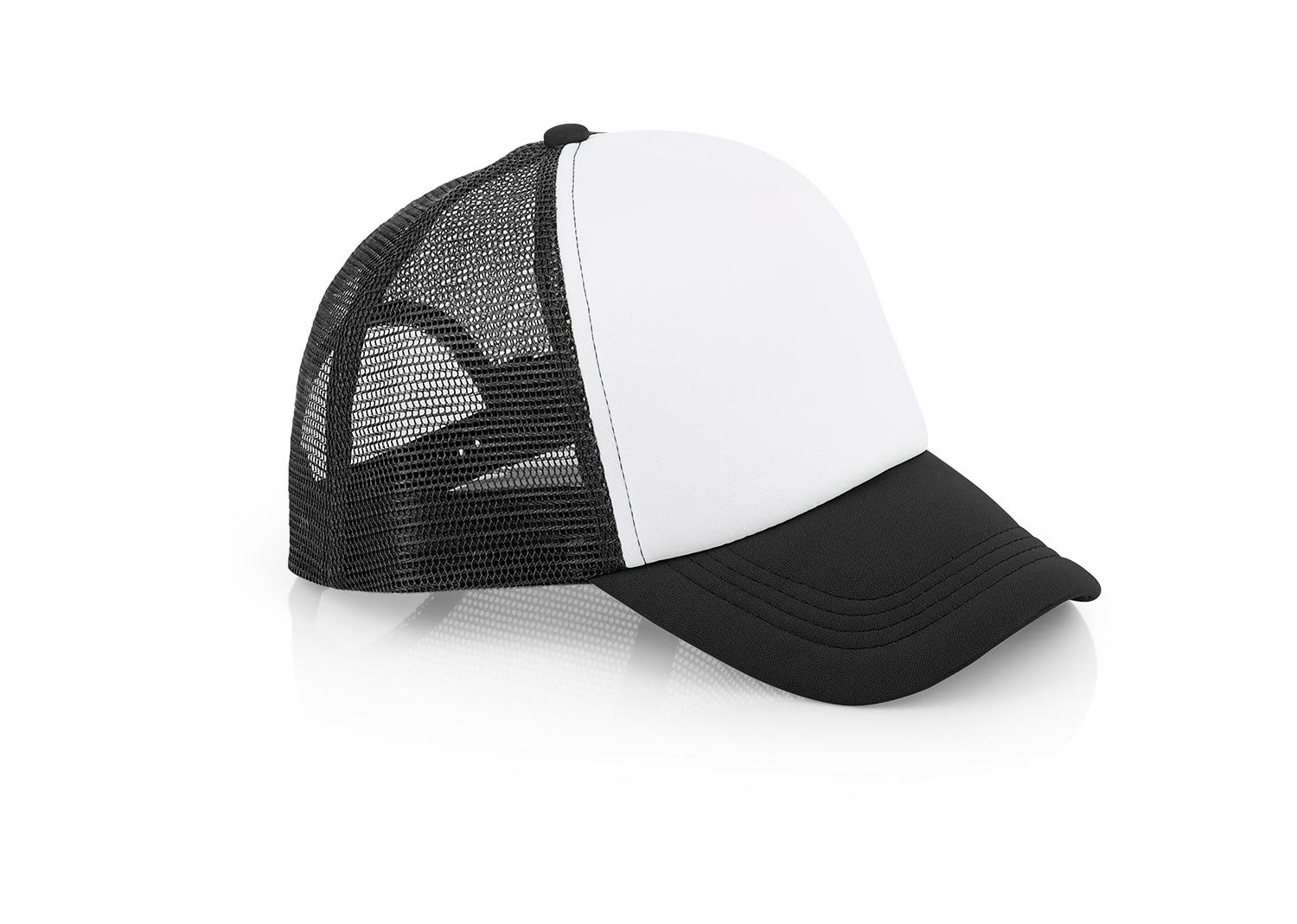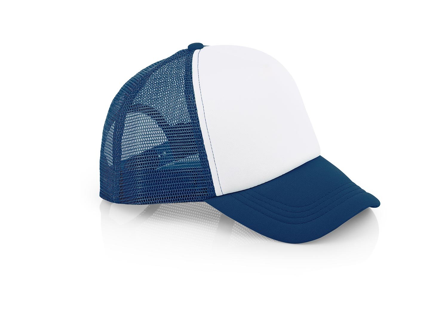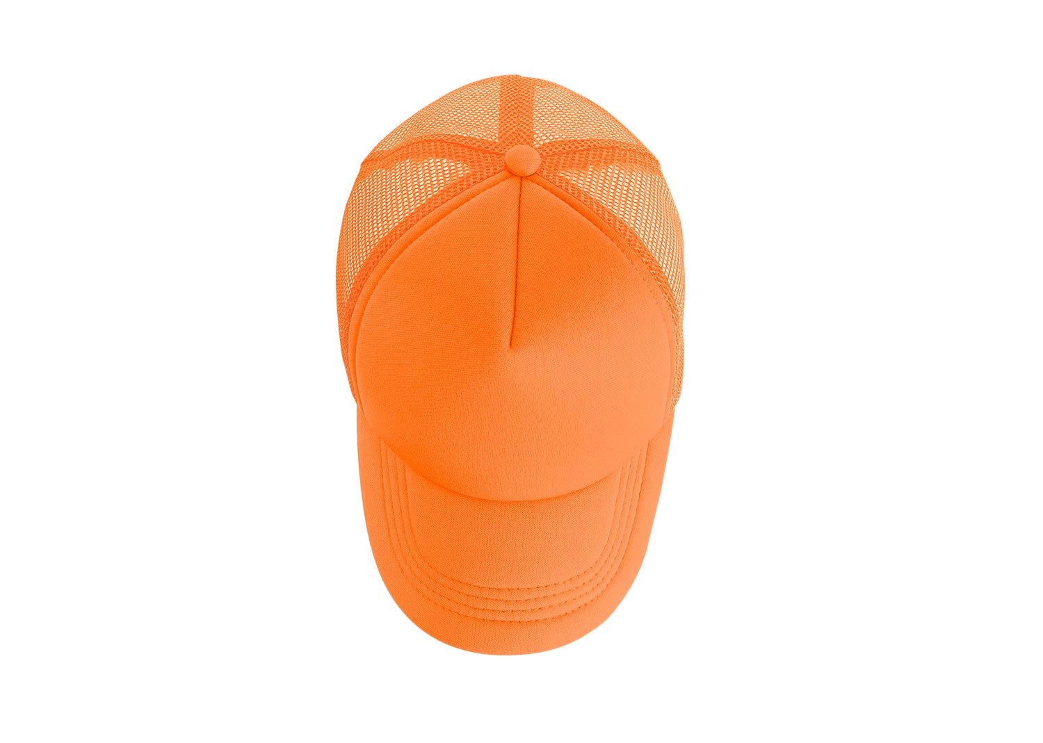 Gorra de 5 paneles con frente fusionado y parte posterior en malla, visera indeformable 4 costuras, botón forrado, tafilete textil y cierre plástico.