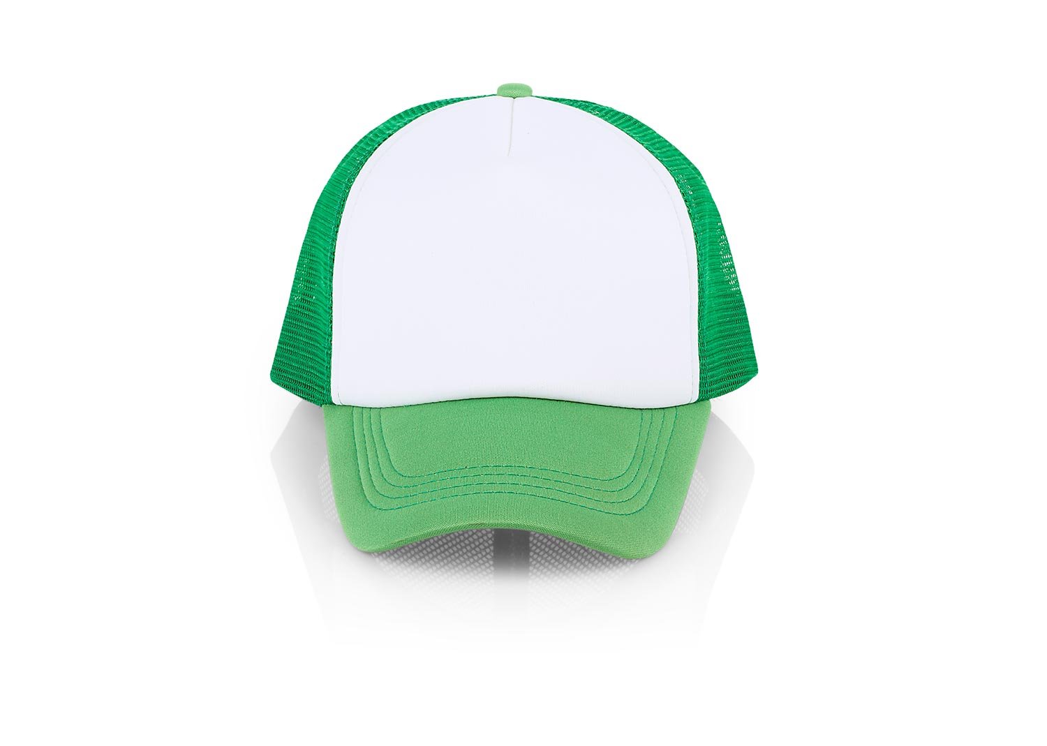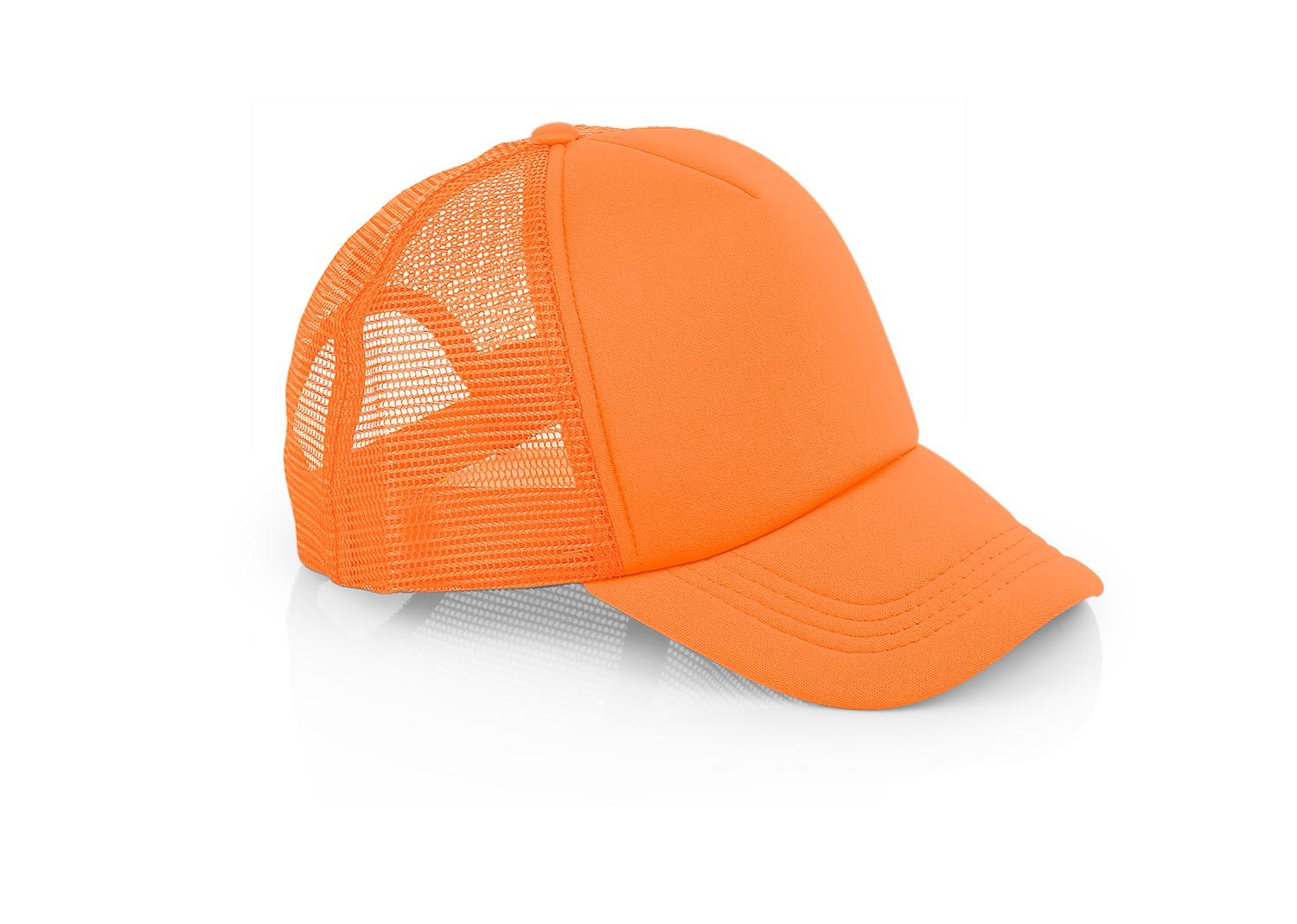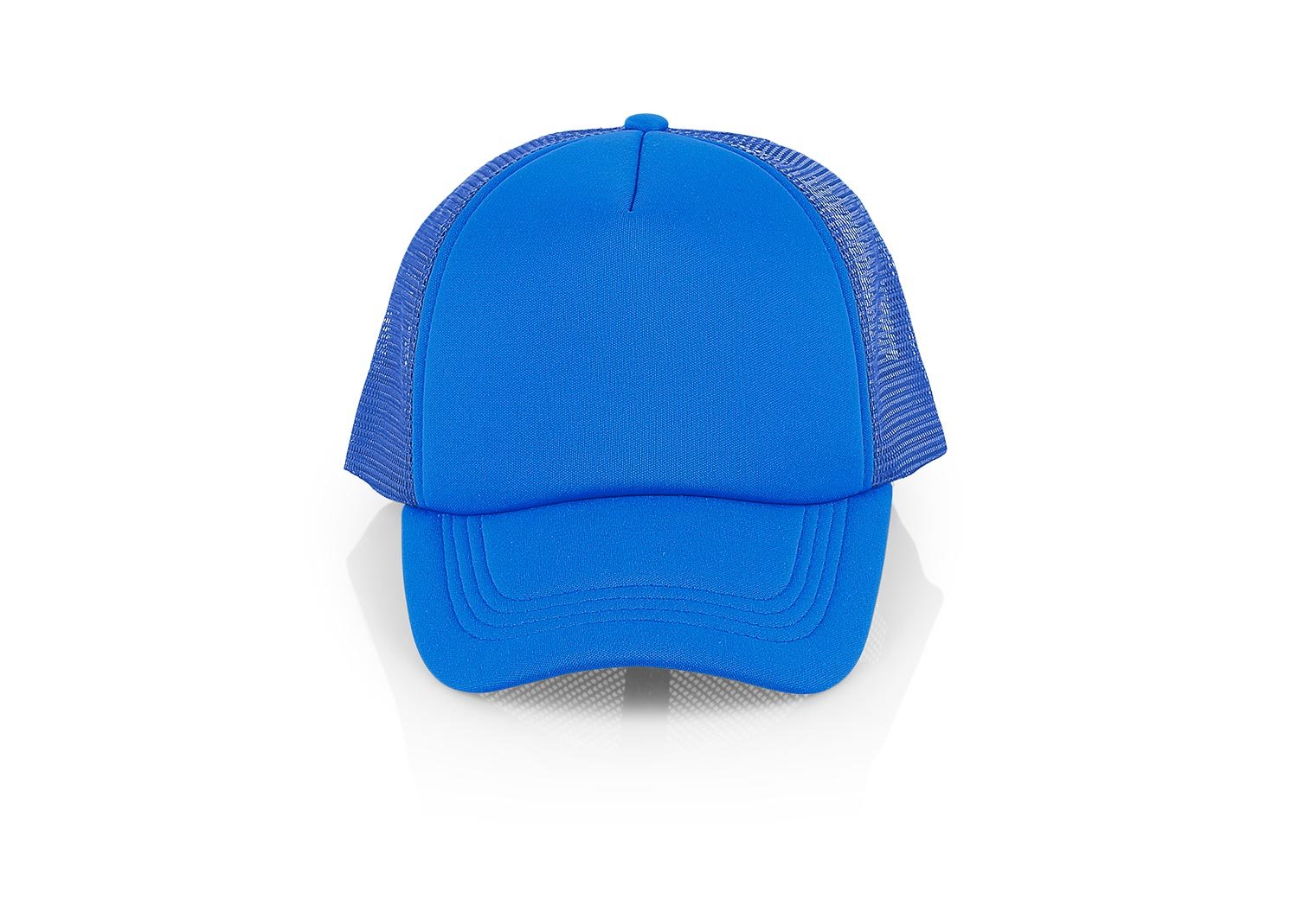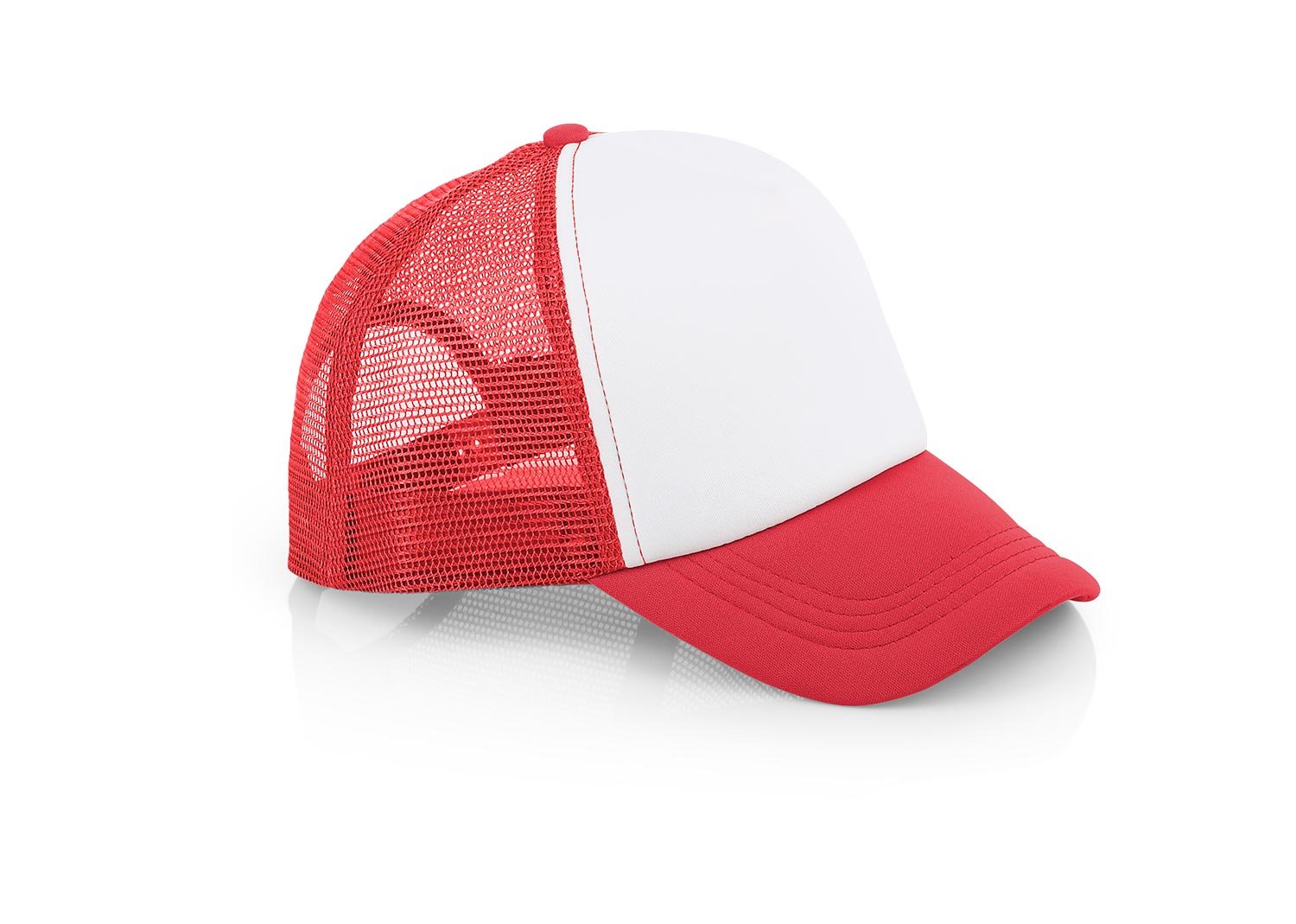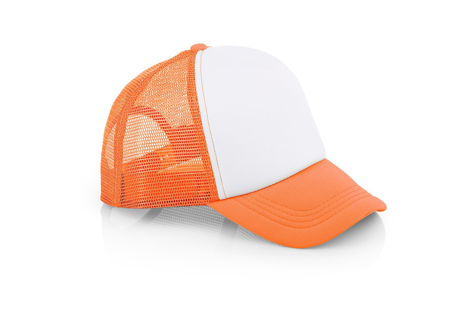 Gorra de 5 paneles con frente fusionado y parte posterior en malla, visera indeformable 4 costuras, botón forrado, tafilete textil y cierre plástico.