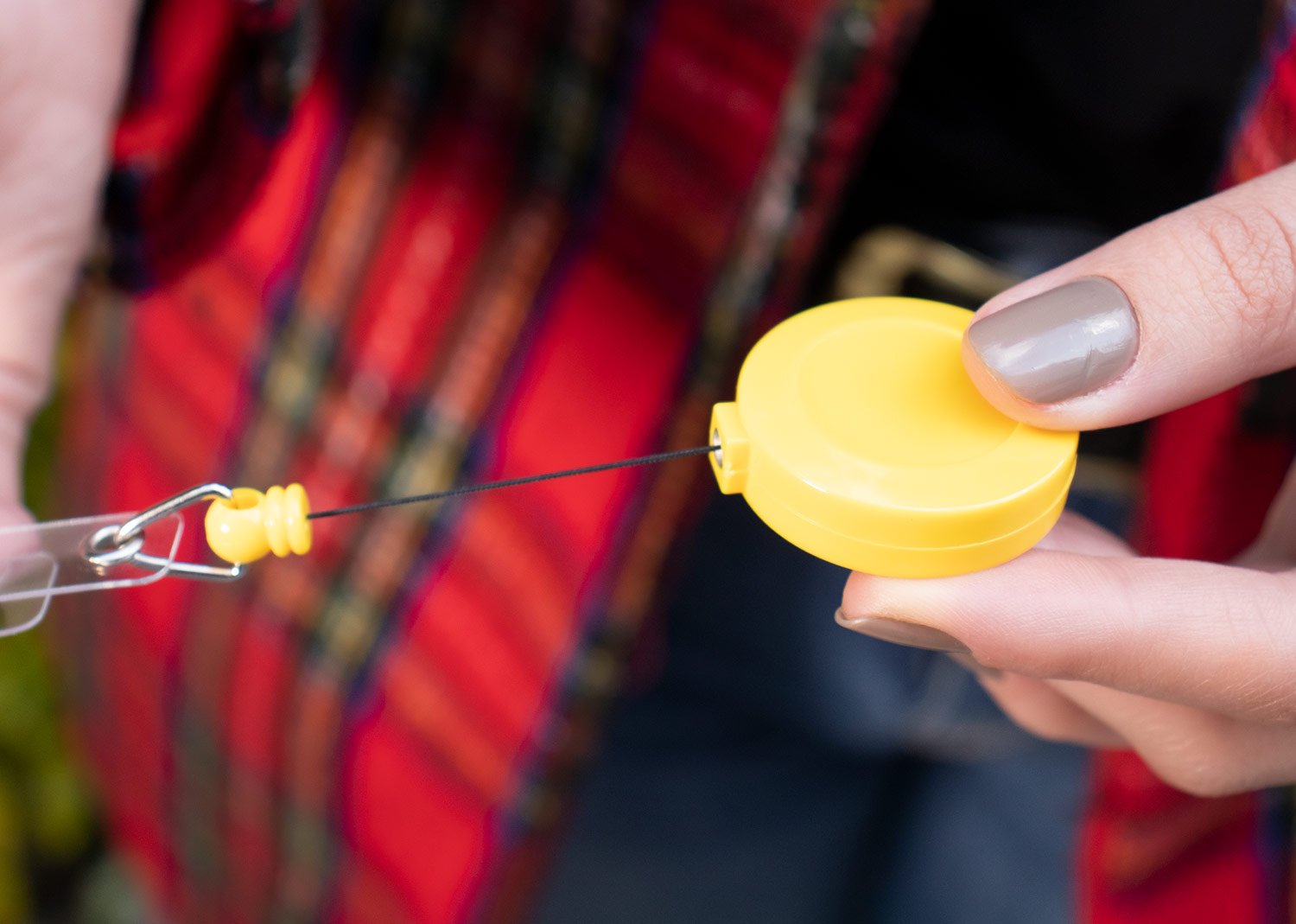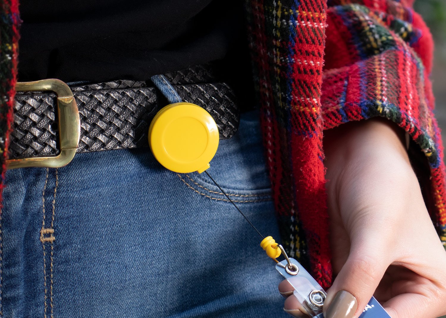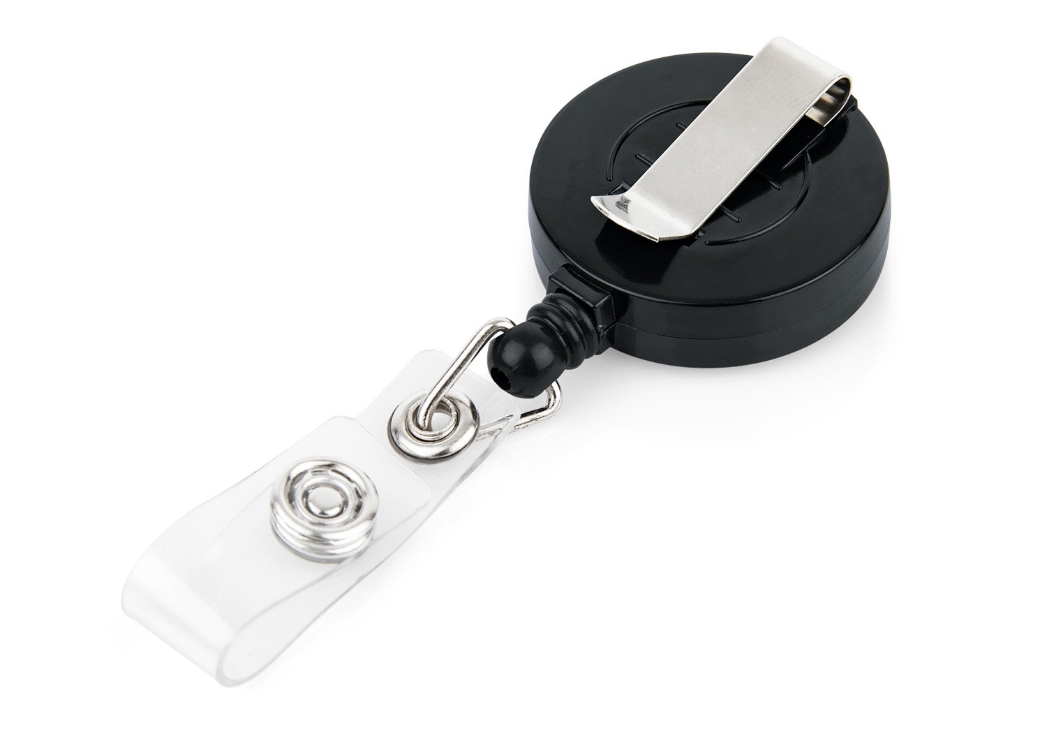 Portacarné con sistema retráctil y clip para bolsillo.