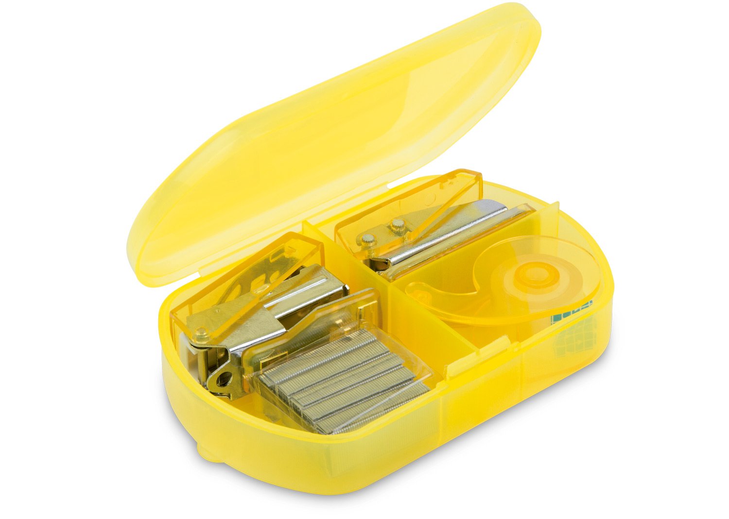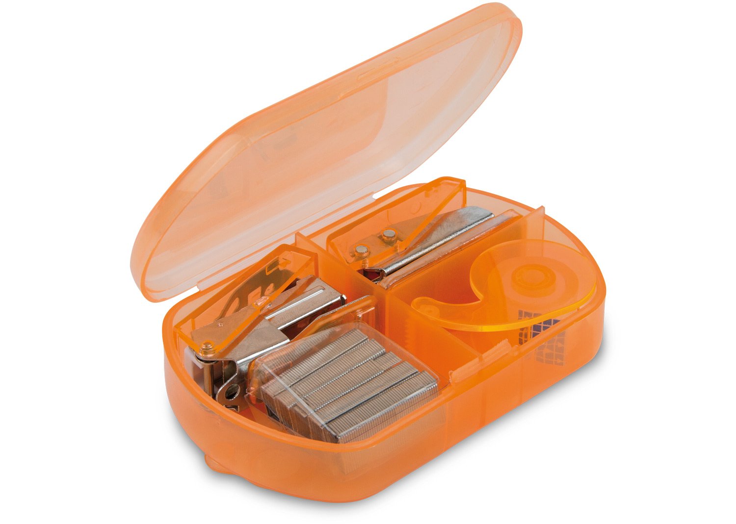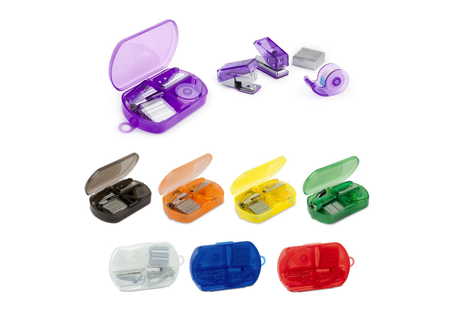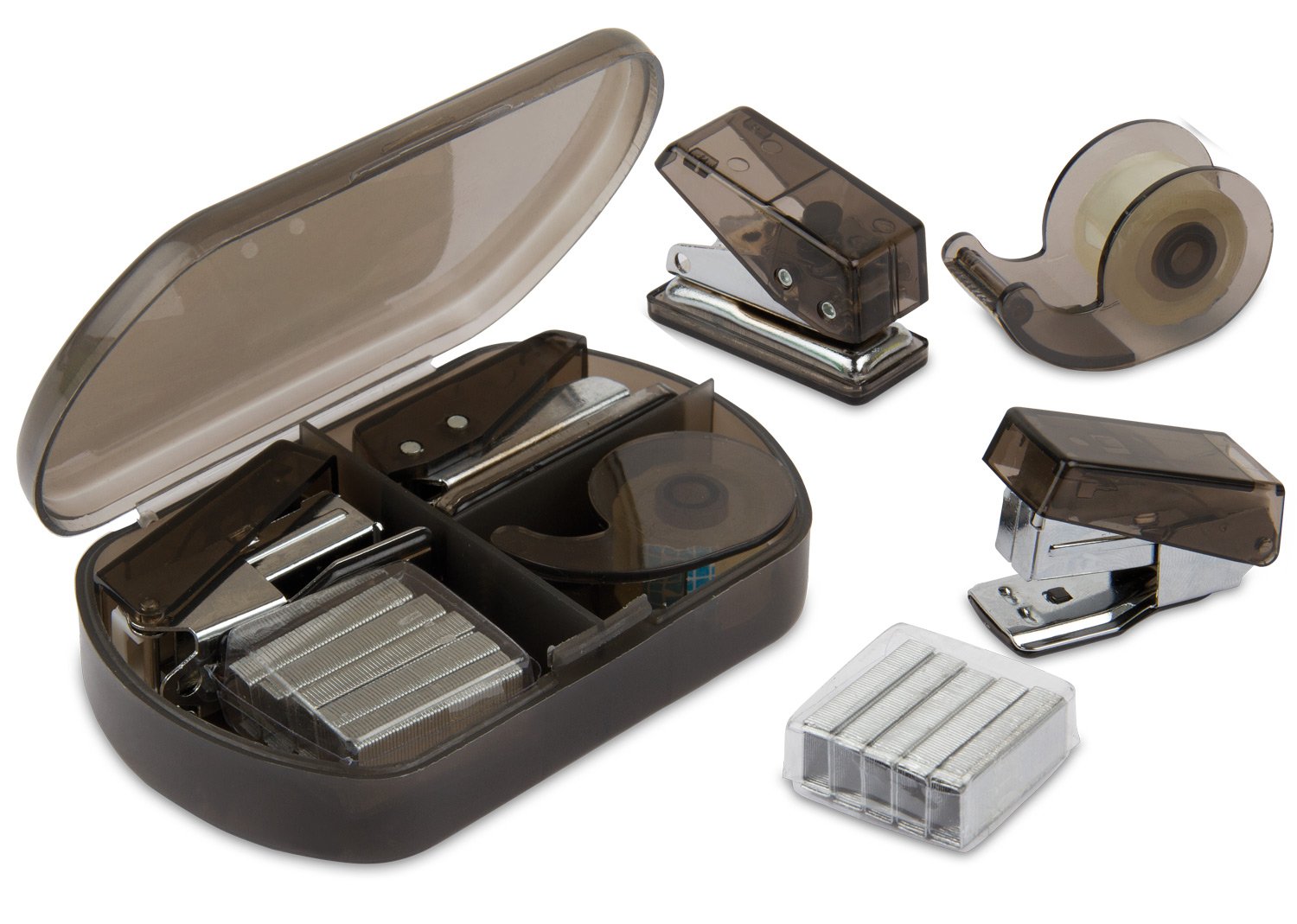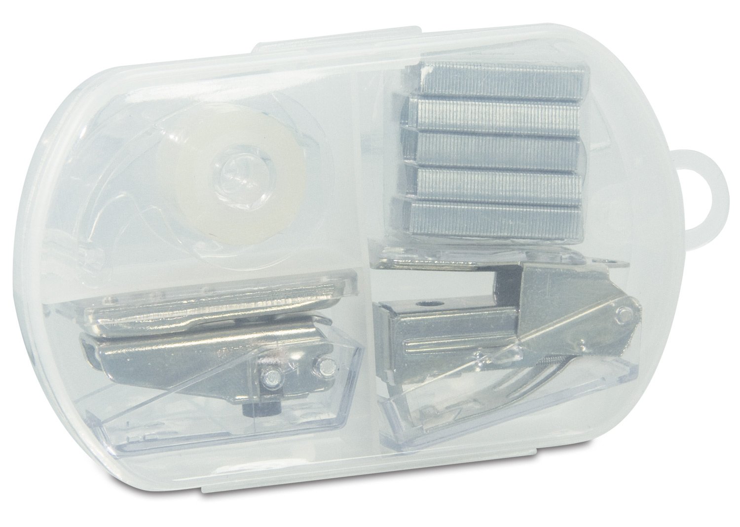 Estuche traslúcido que contiene: Perforadora, dispensador de cinta adhesiva, cosedora y ganchos de respuesto x 5.