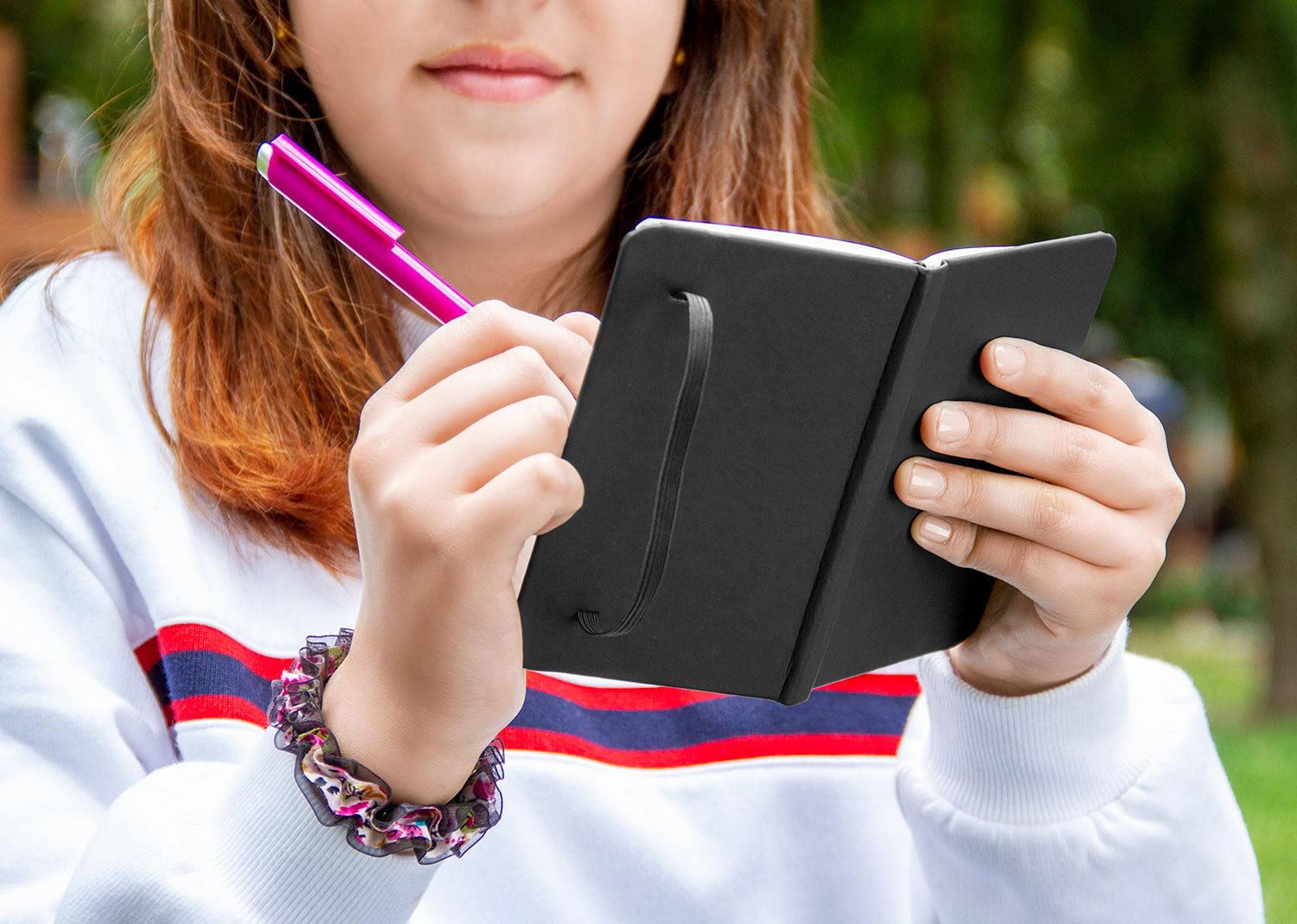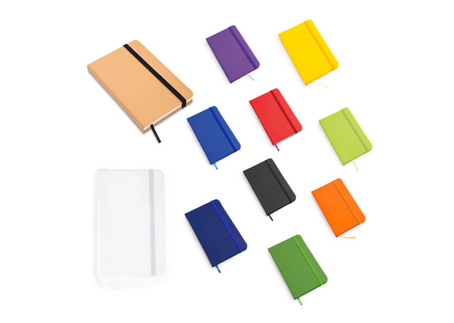 Libreta con cubierta forrada en imitación cuero. Con banda elástica de cierre. Cinta marcadora. 80 hojas blancas. Tamaño aproximado A6. La libreta de color Natural viene con cubierta de cartón reciclado.