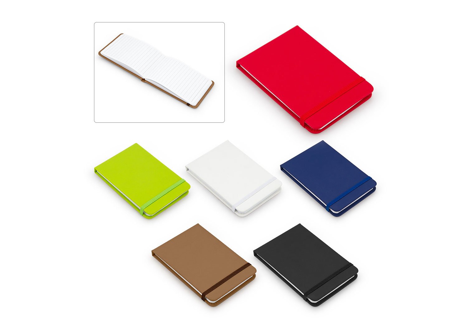 Libreta de notas vertical en PU, 80 hojas de papel rayado y banda elástica de cierre. Tamaño aproximado: A7.