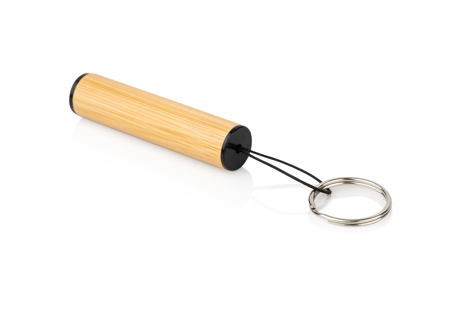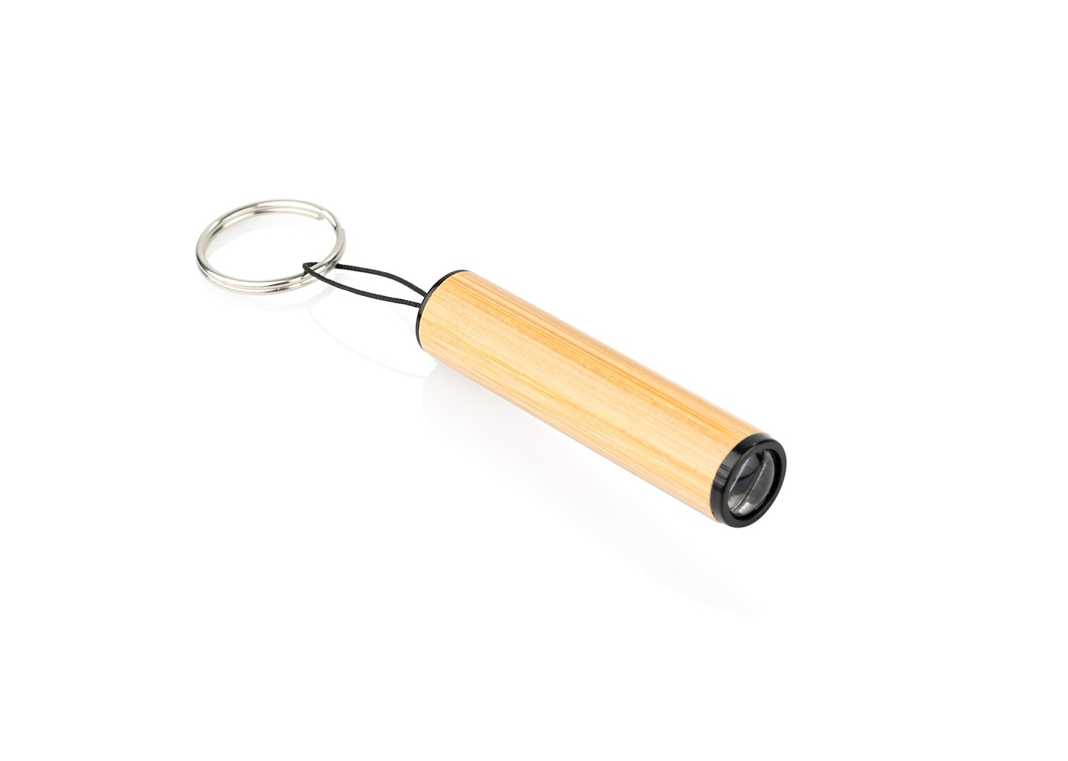 Mini linterna LED con revestimiento de bambú, pequeña y fácil de usar. Incluye aro para llaves.