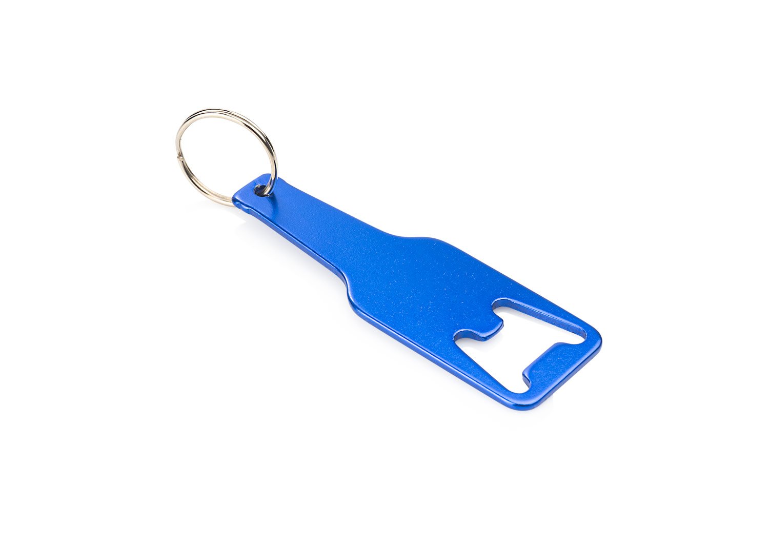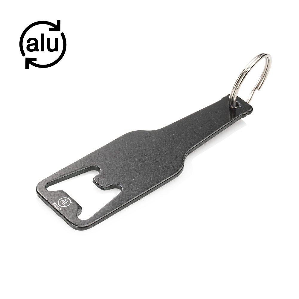 Llavero destapador de aluminio reciclado con forma de botella.