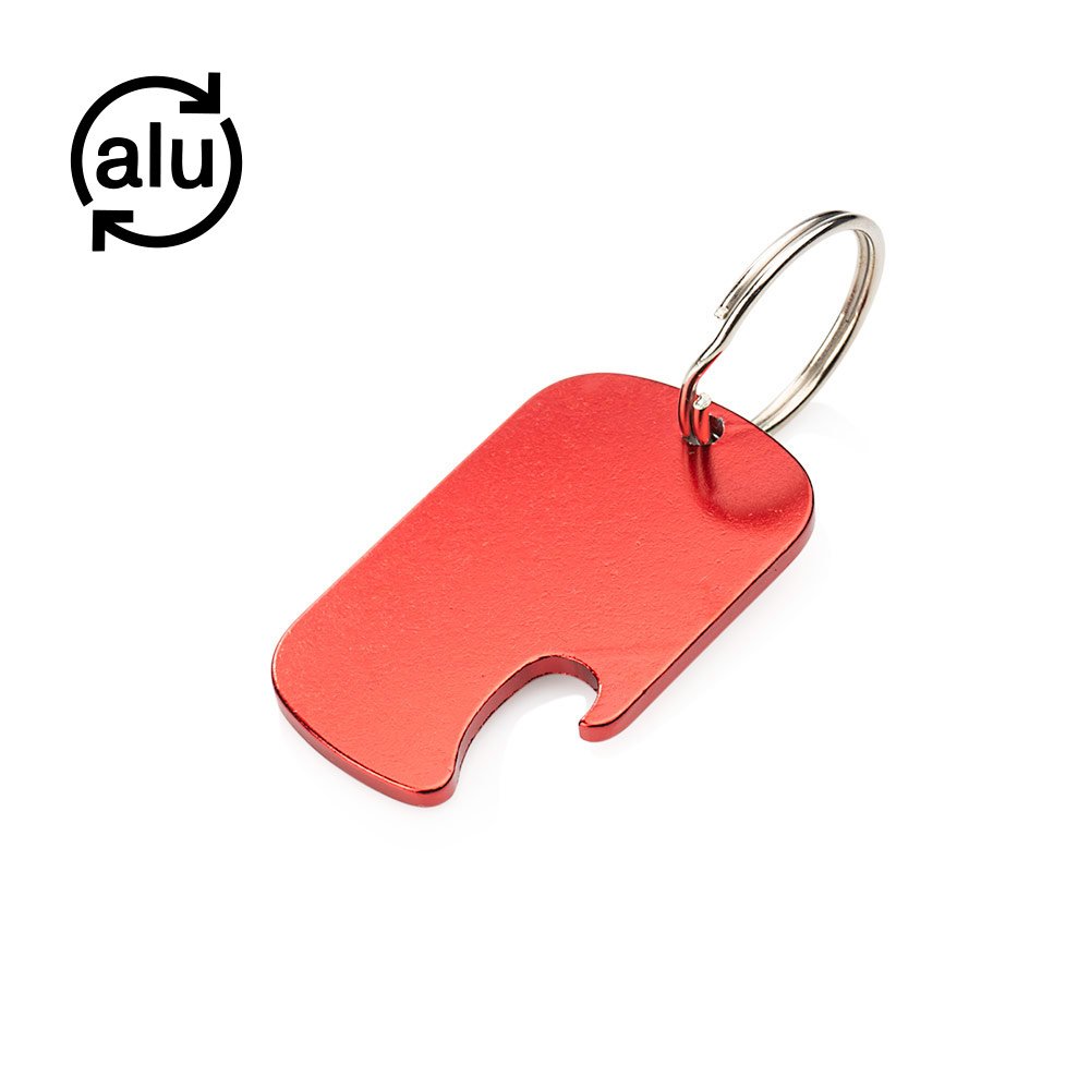 Llavero destapador de aluminio reciclado, con zona amplia para impresión de la marca.