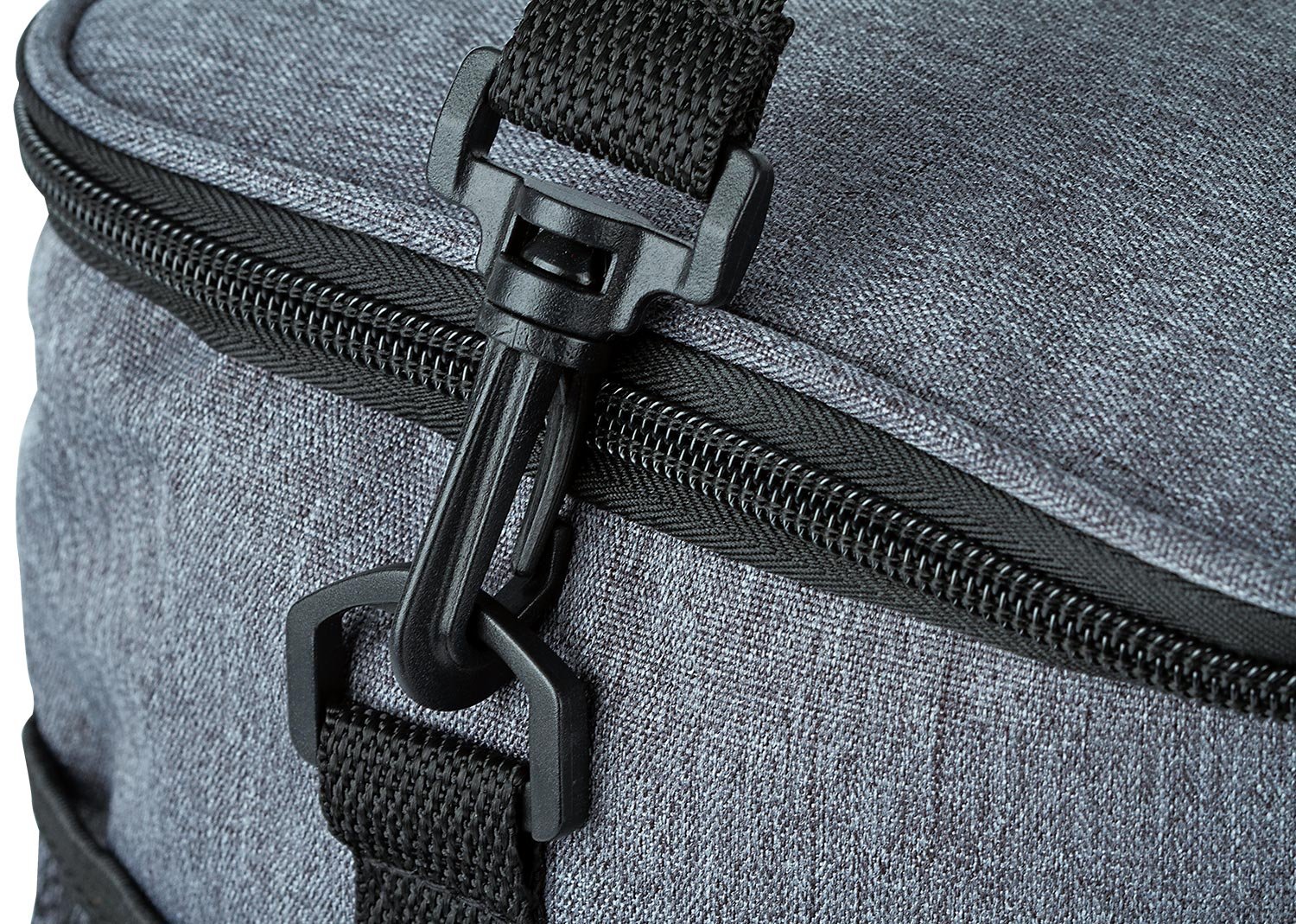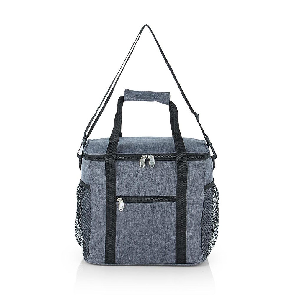Lonchera térmica con recubrimiento interior en PEVA que conserva las bebidas o alimentos fríos por más tiempo, bolsillo principal y frontal con cierre en cremallera y bolsillos laterales en malla. Con práctica agarradera de mano y cargadera larga ajustable.