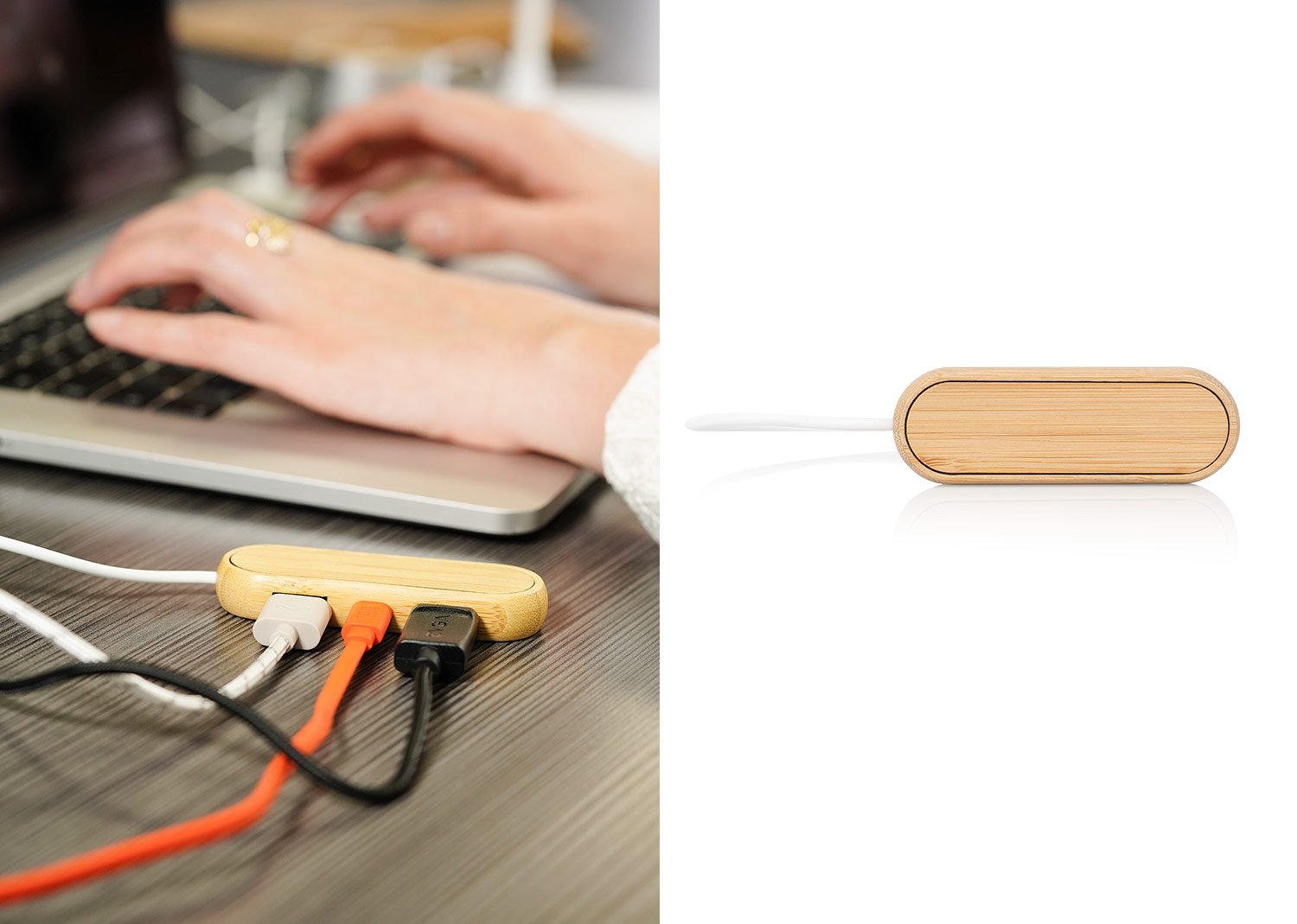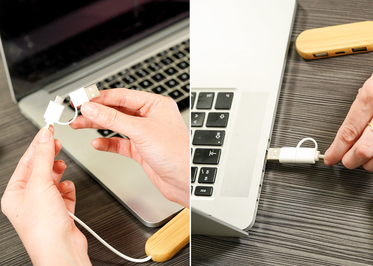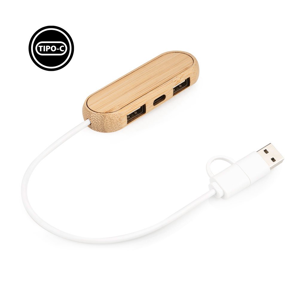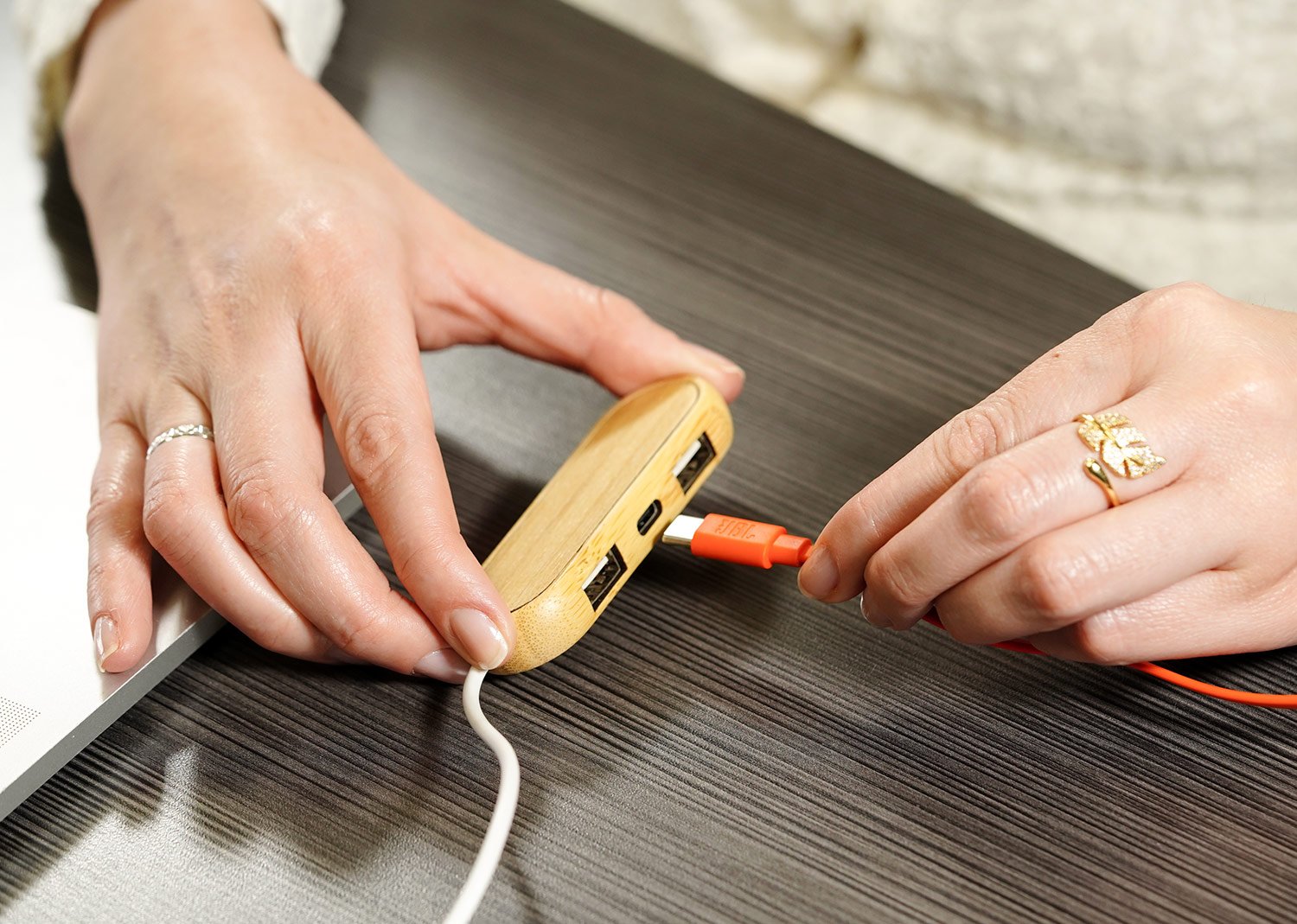 Multipuerto USB 2.0 que incluye dos puertos de salida USB-A para carga y transmisión de datos, y un puerto Tipo-C para las mismas funciones. Además, cuenta con puertos de entrada USB-A y Tipo-C.