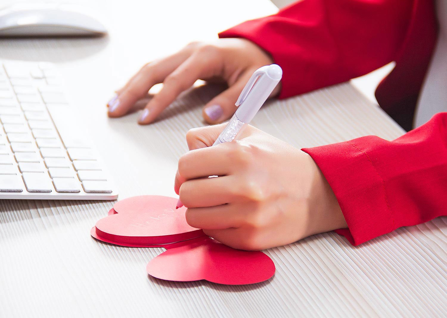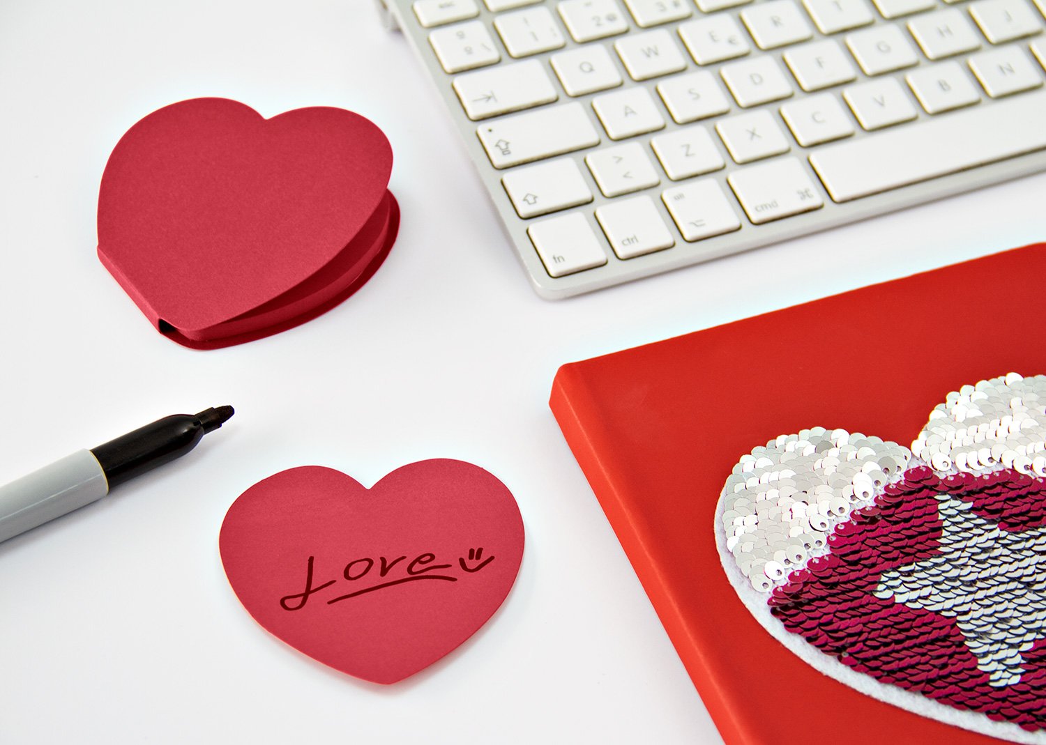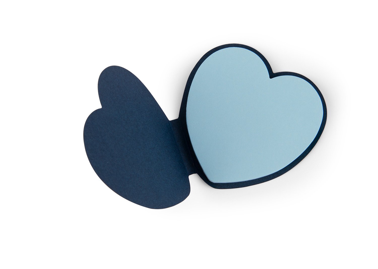 Memo en forma de corazón con 50 notas adhesivas del mismo color de la cubierta.