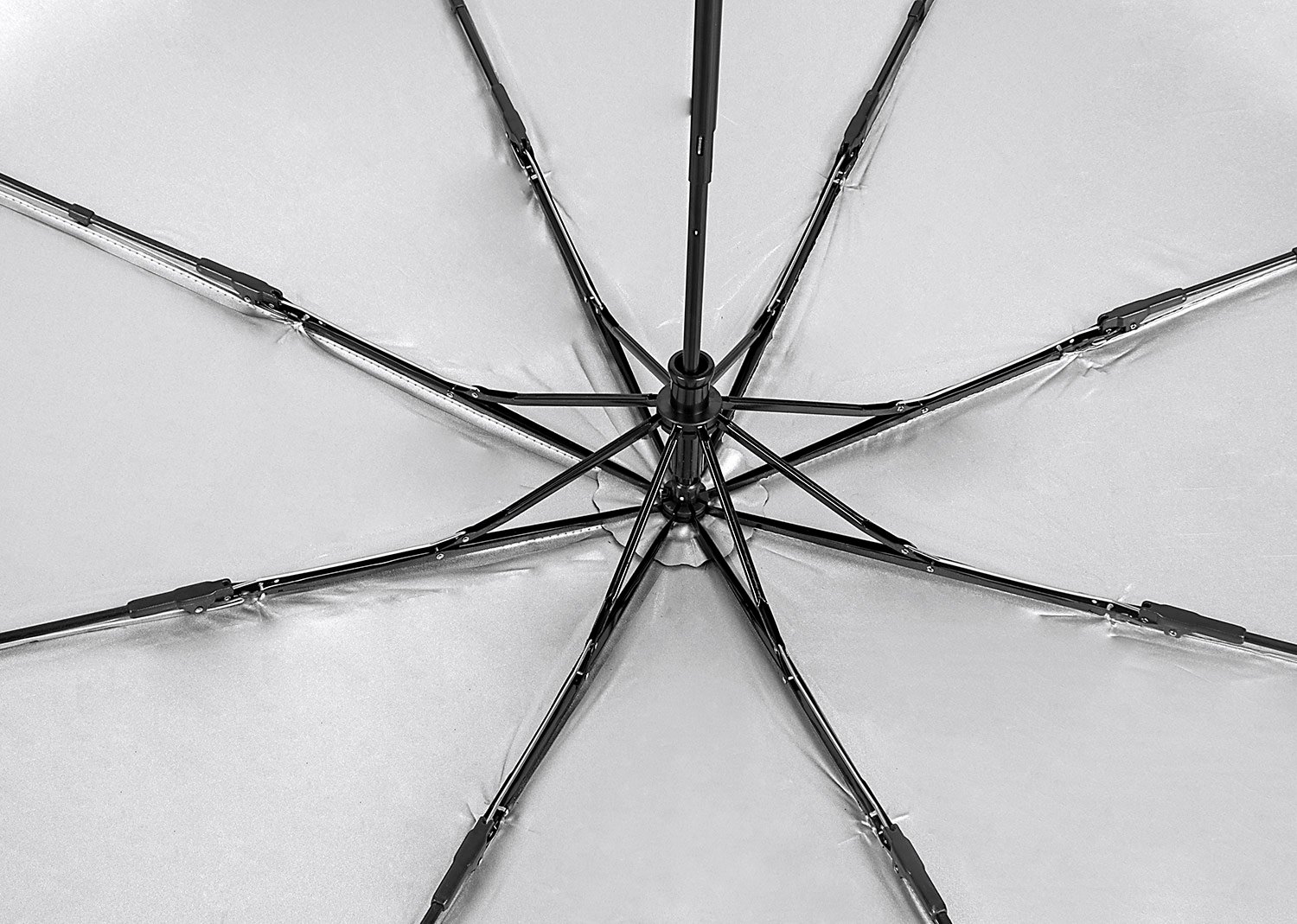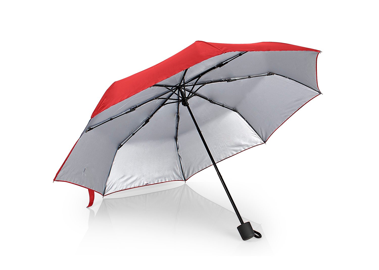Paraguas 21» con sistema apertura y cierrre manual en 3 secciones, 8 cascos, varillas de fibra de vidrio, manco en acabado de goma, tela de poliéster 190t con recubrimiento interior plateado, incluye funda del color de paraguas.