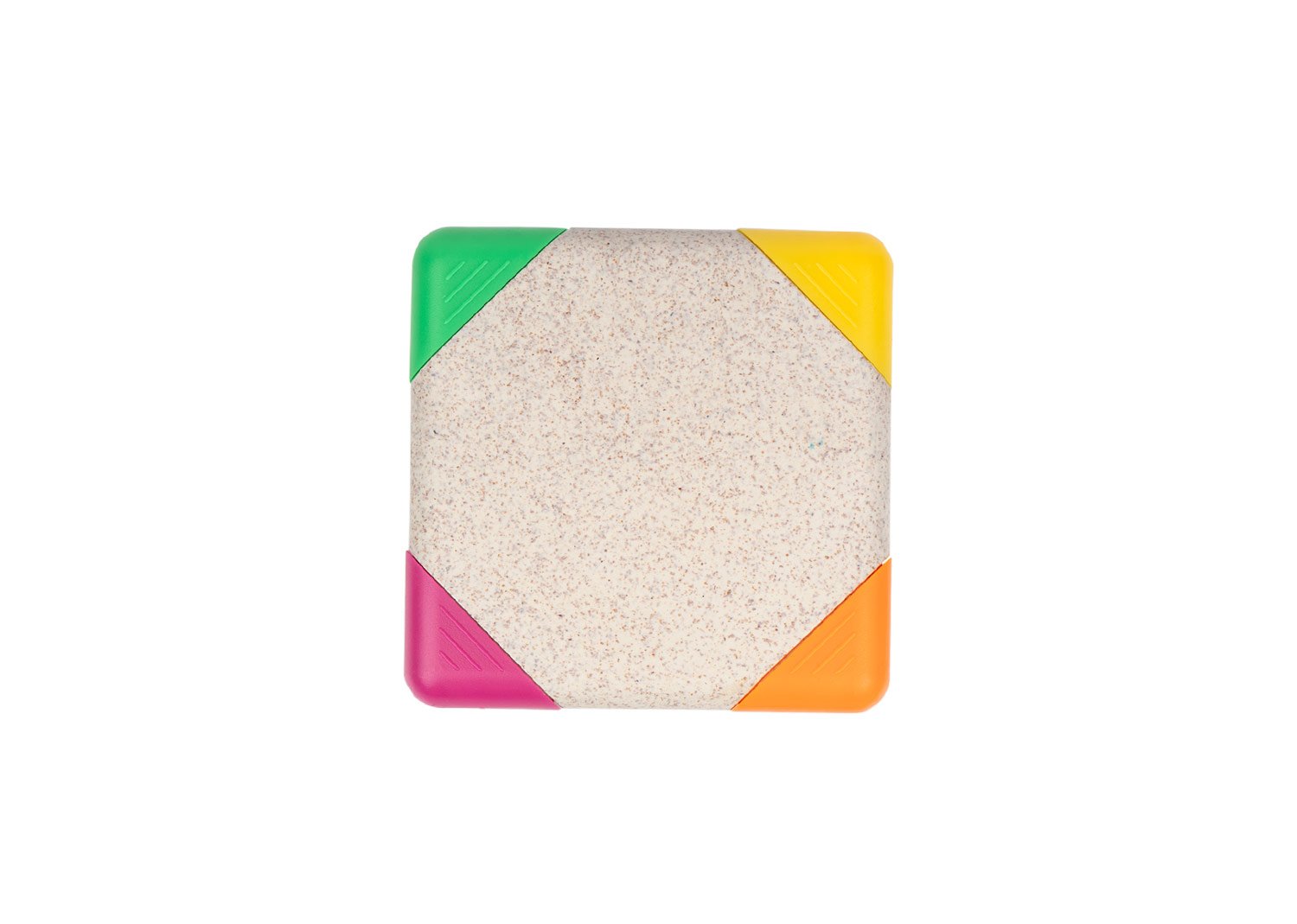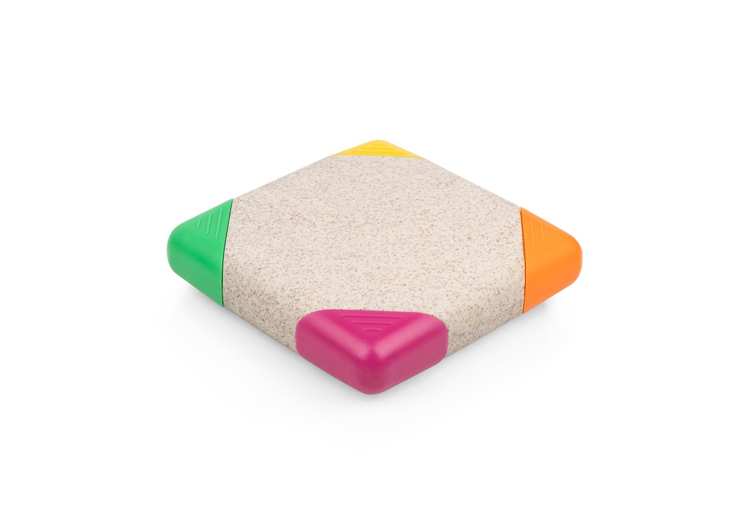 Resaltador con forma cuadrada, con 4 colores de tinta: verde, amarillo, naranja y rosado. Elaborado con paja de trigo.