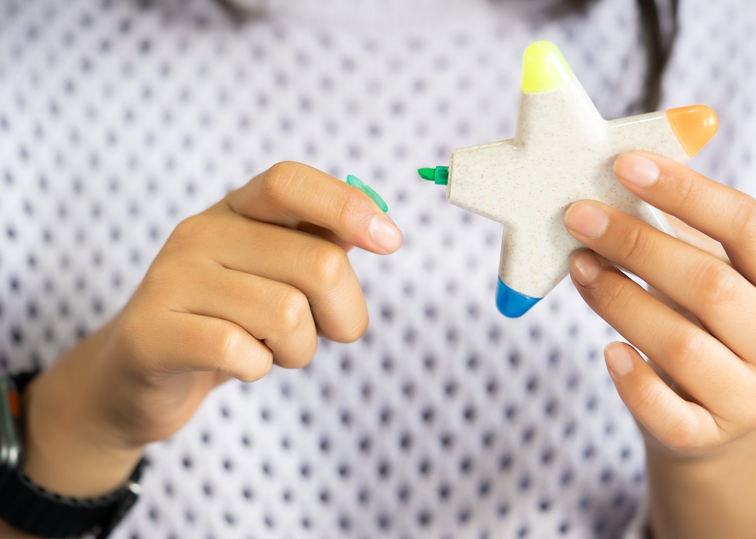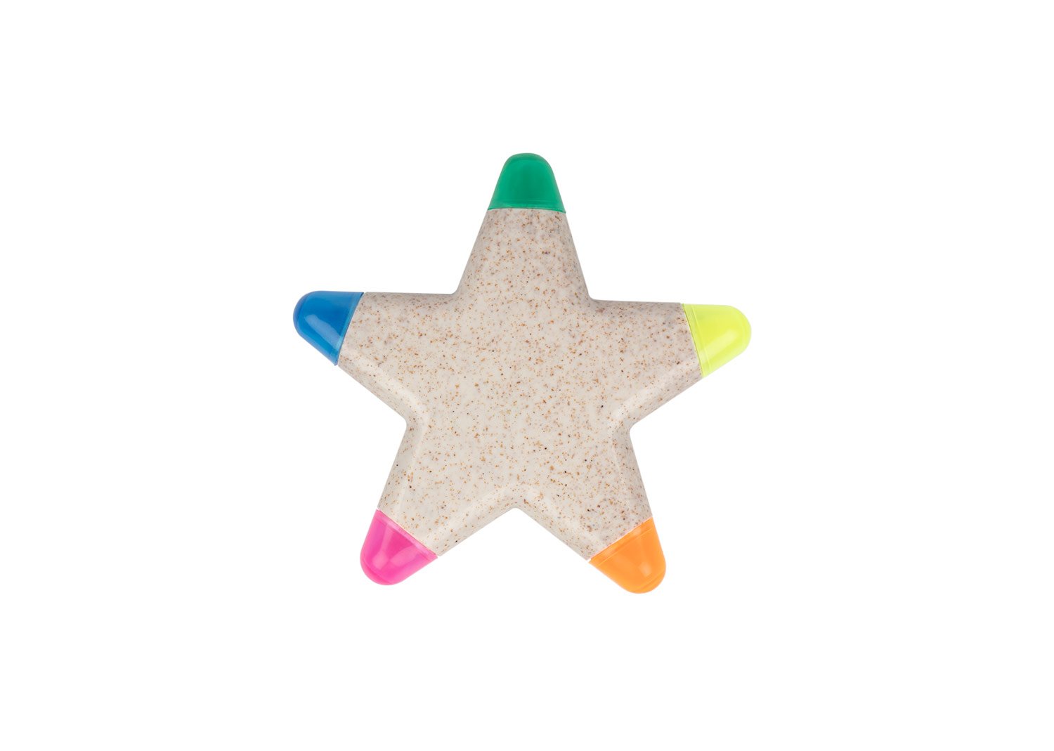 Resaltador con forma de estrella, con 5 colores de tinta: azul, verde, amarillo, naranja y rosado. Elaborado con paja de trigo.