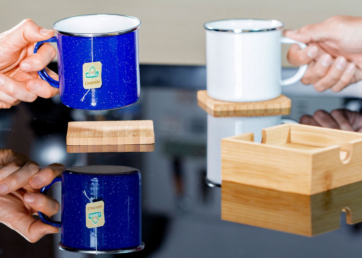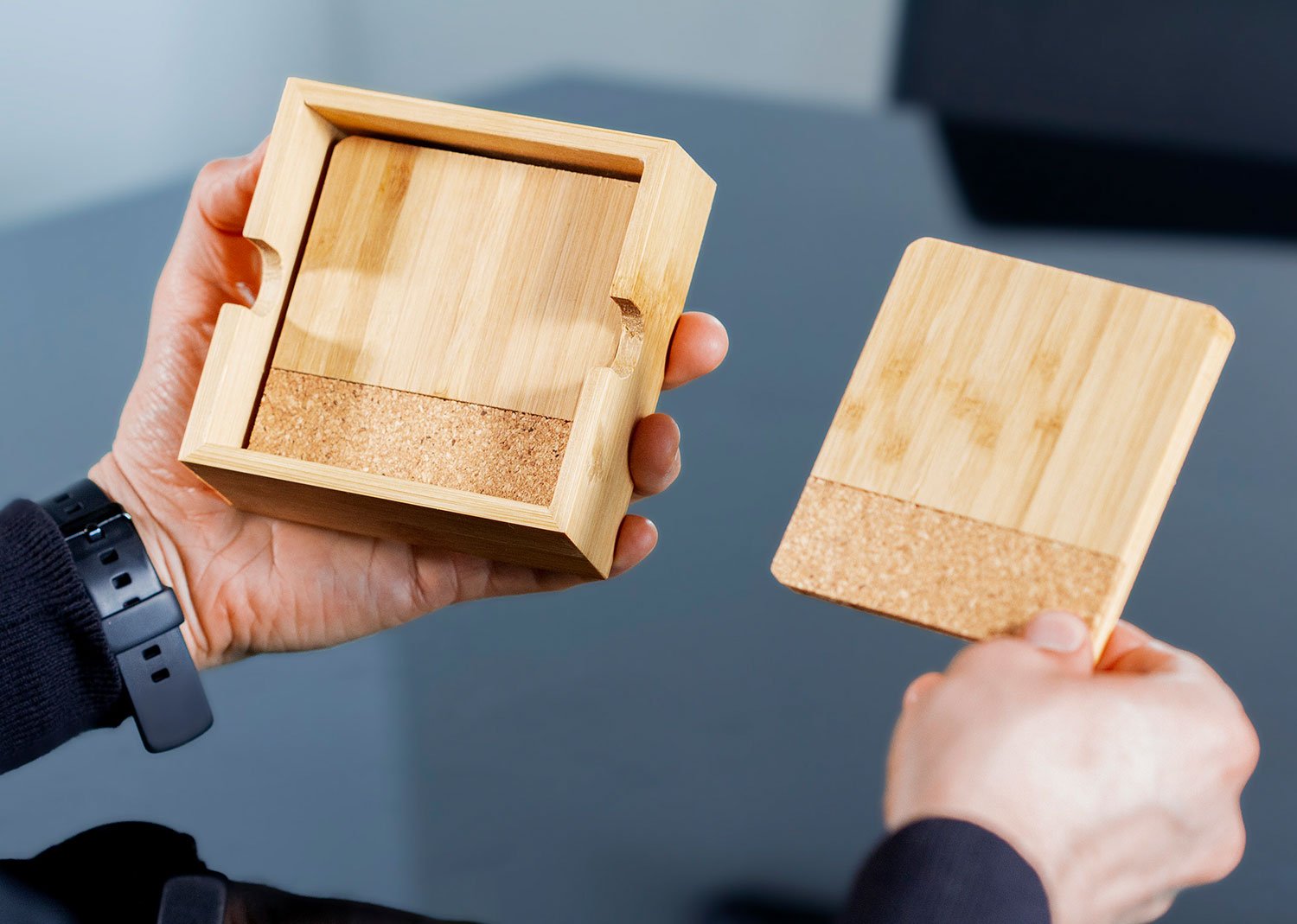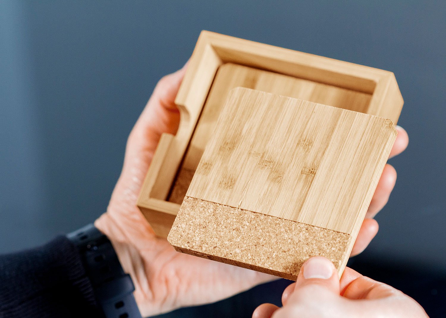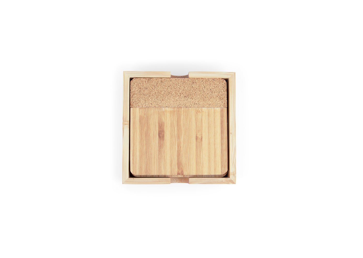 Set de Portavasos en Bambú y corcho x 4 uds con estuche en Bambú. Lavar con agua y jabón y dejar secar al aire libre.