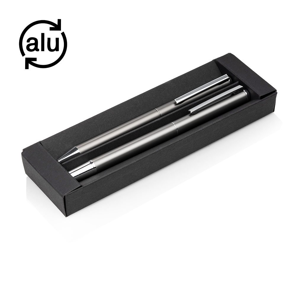 Set de bolígrafos hechos con aluminio reciclado. Cada bolígrafo es retráctil de mina normal más bolígrafo roller, con tapa a presión. Incluyen estuche de lujo.