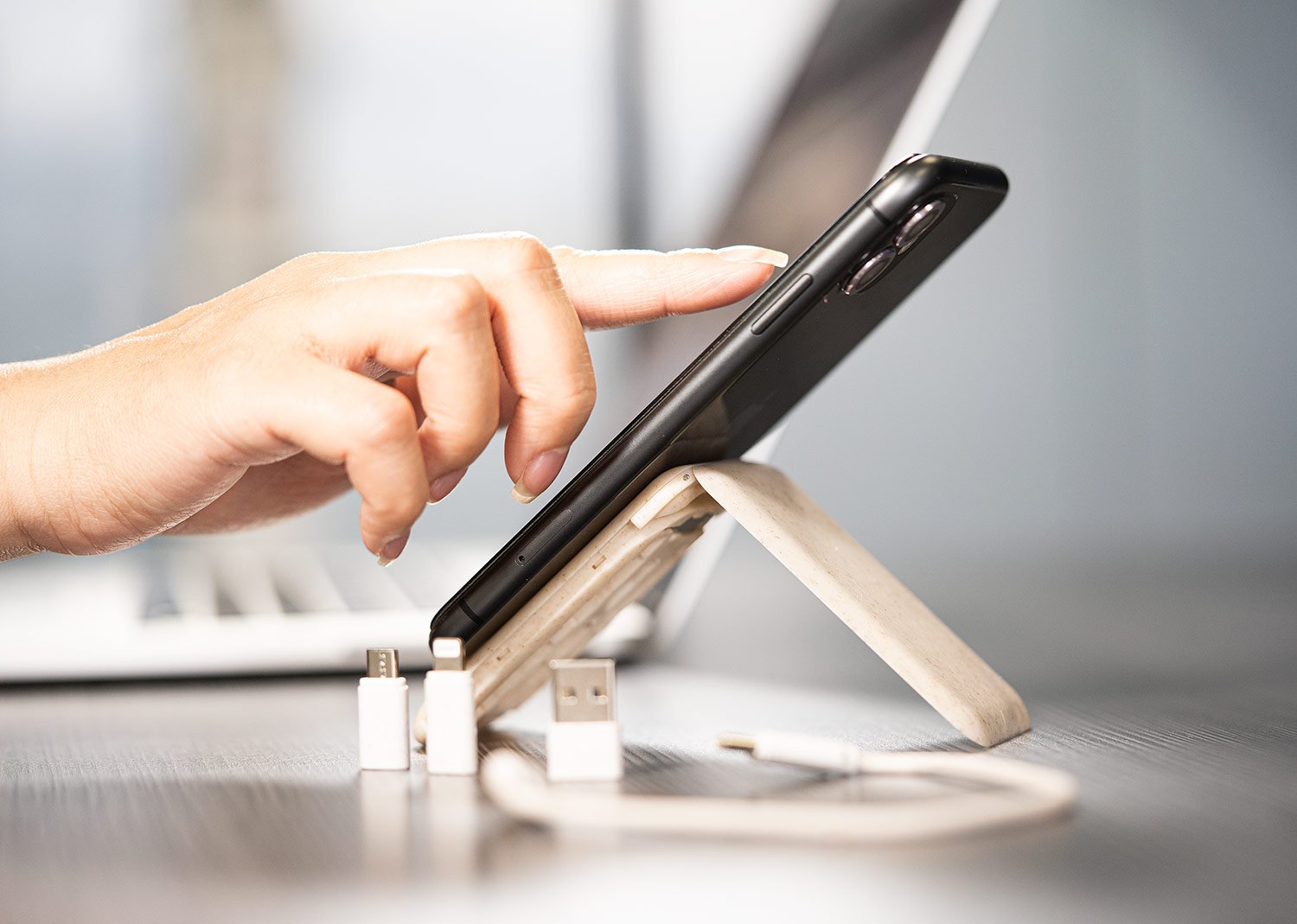 Juego de cables de carga con puertos USB, Tipo-C y Lightning, 5V DC 3.1, que incluye un adaptador para expulsar la tarjeta SIM del celular. El estuche puede usarse como soporte para el teléfono móvil.