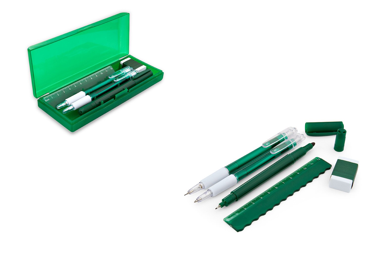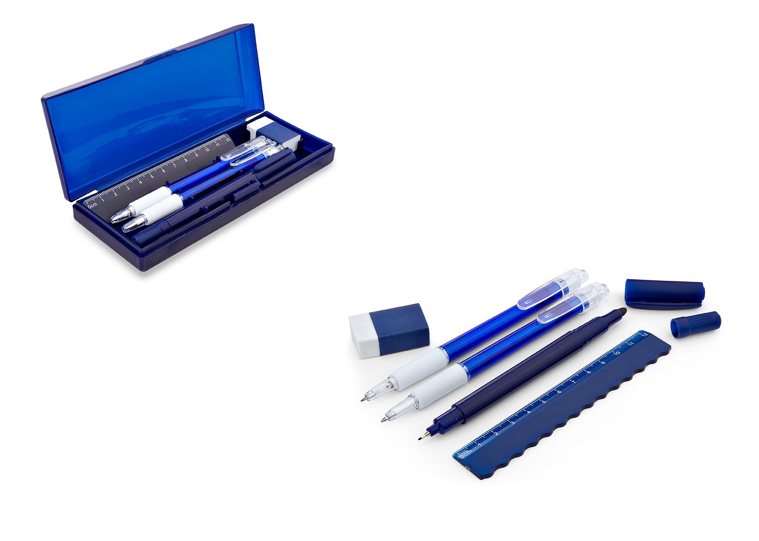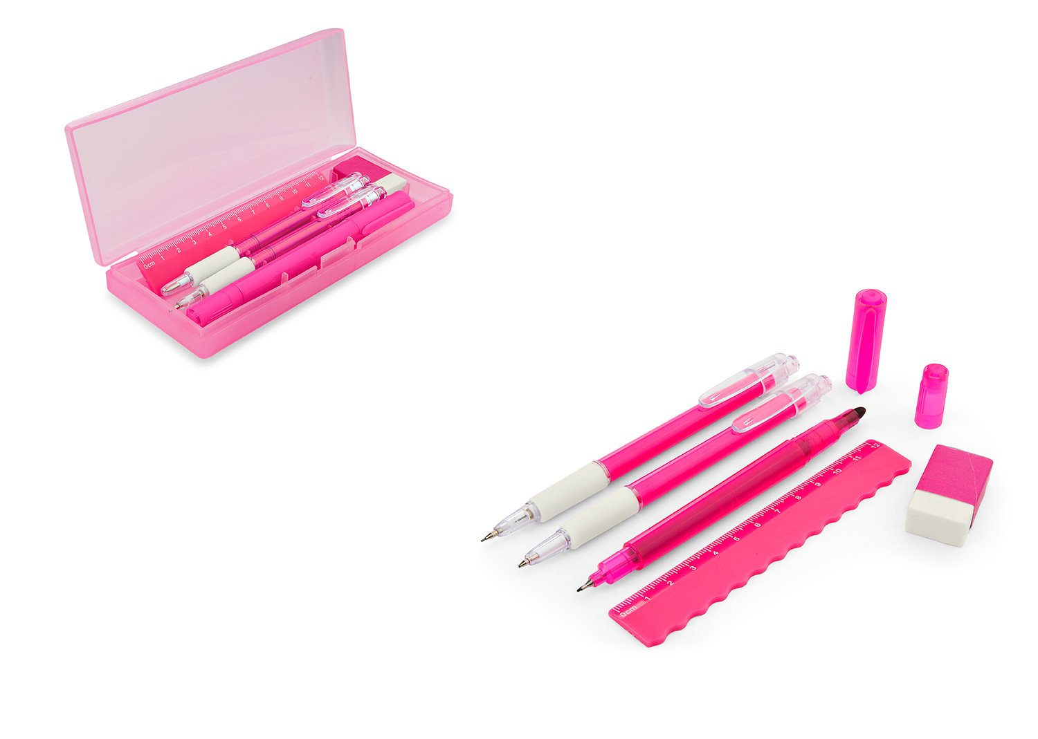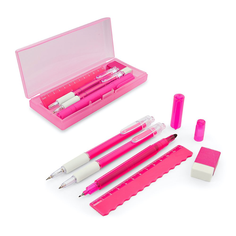 Set de escritorio en estuche plástico, contiene: resaltador, bolígrafo, portaminas, regla y borrador.
