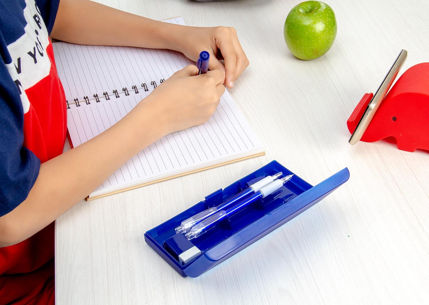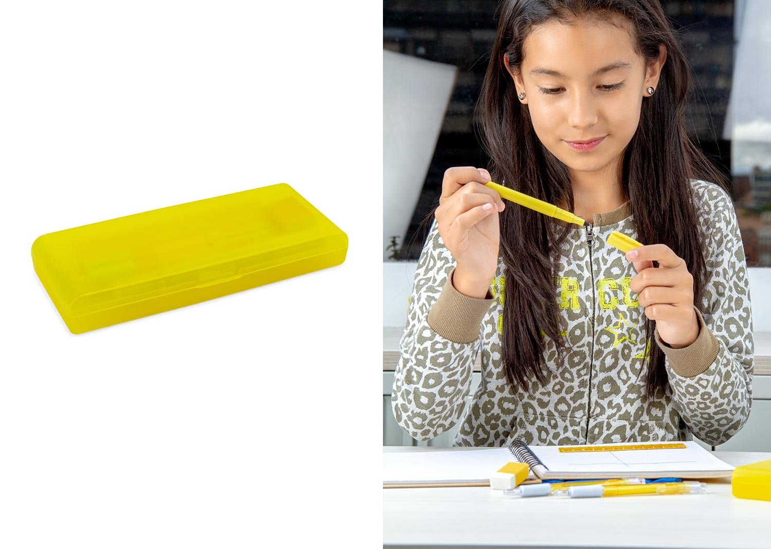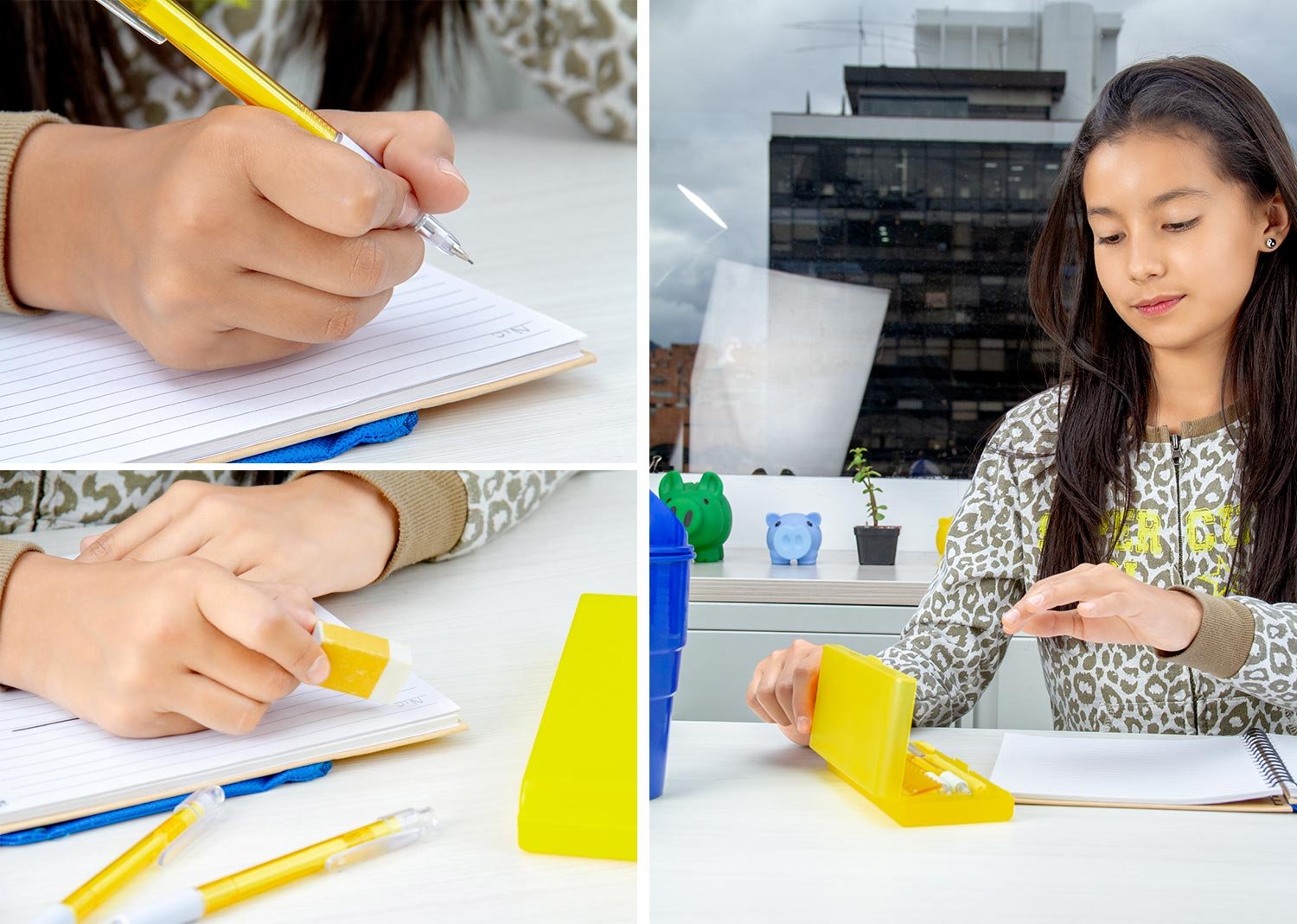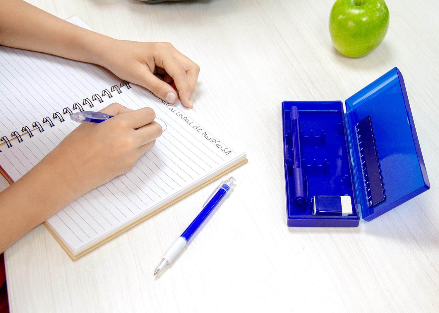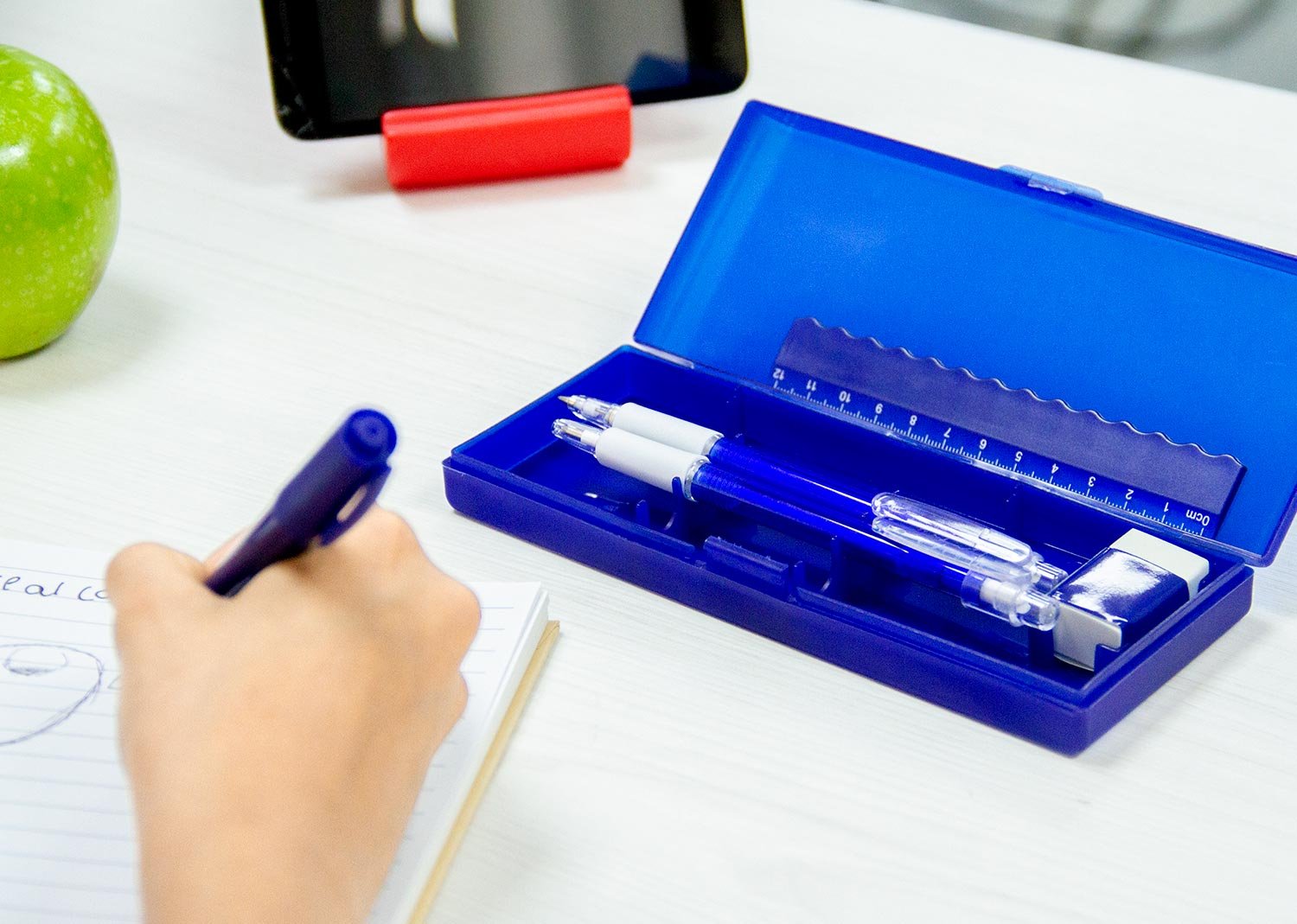 Set de escritorio en estuche plástico, contiene: resaltador, bolígrafo, portaminas, regla y borrador.