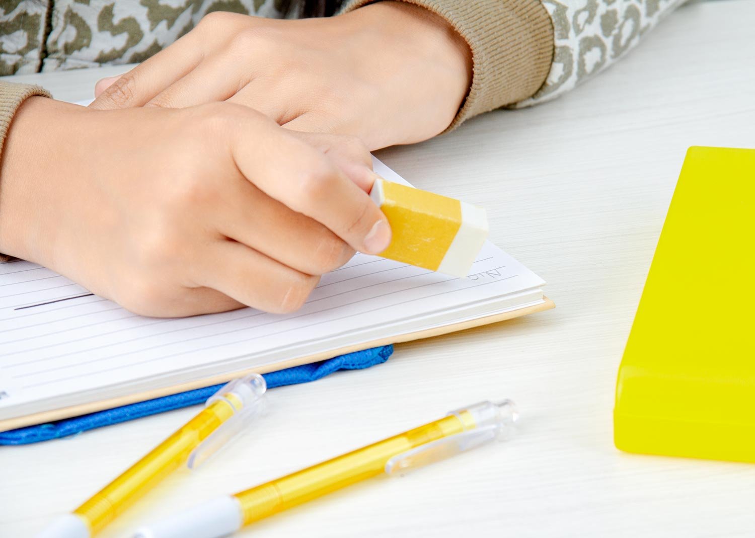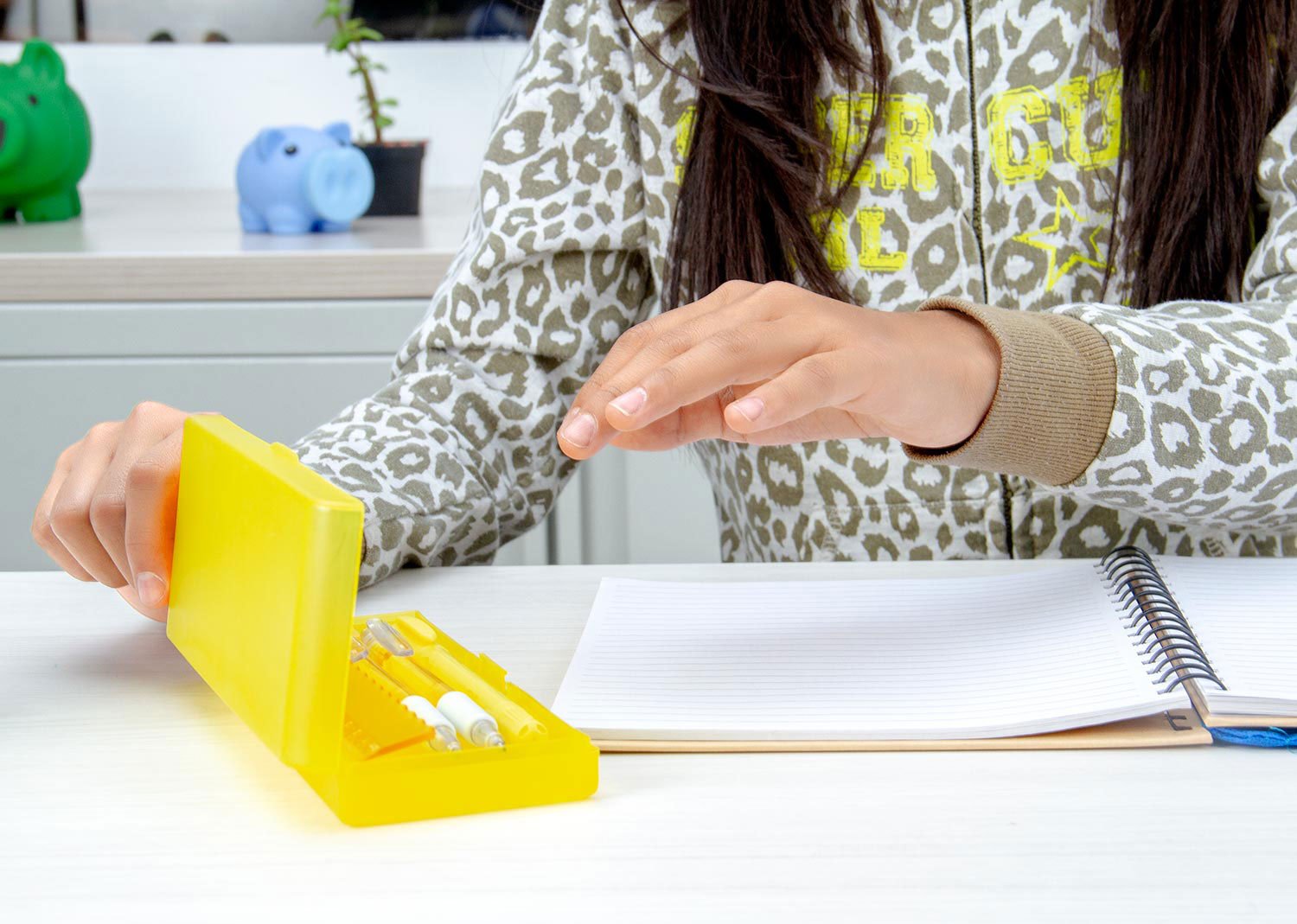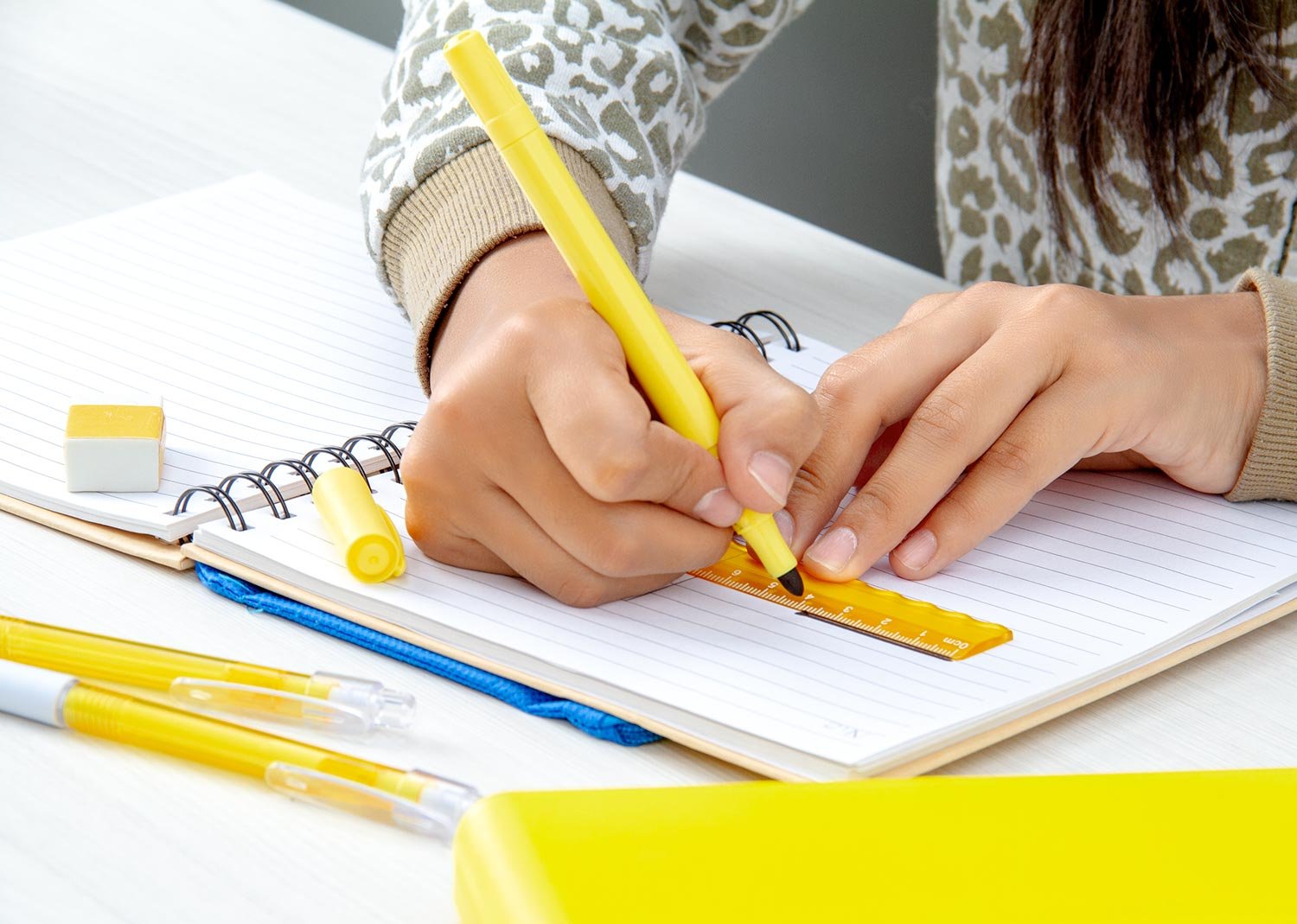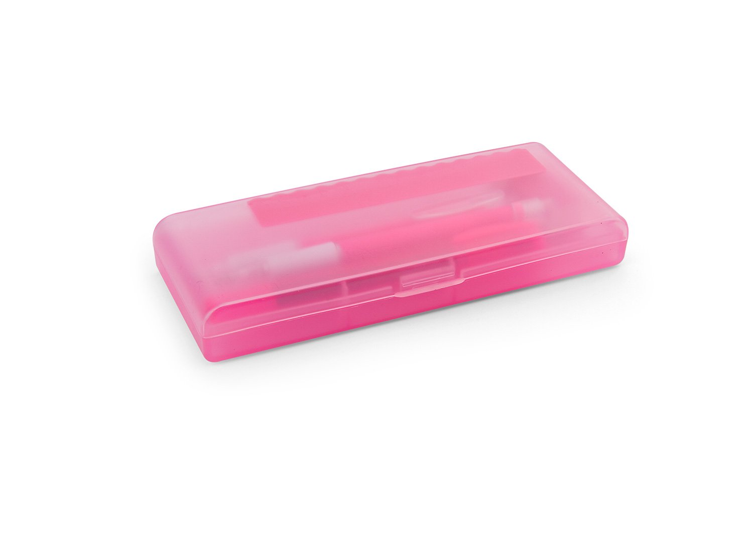 Set de escritorio en estuche plástico, contiene: resaltador, bolígrafo, portaminas, regla y borrador.