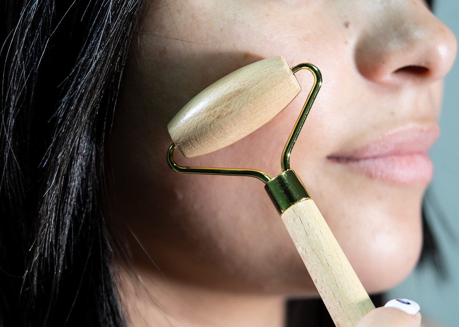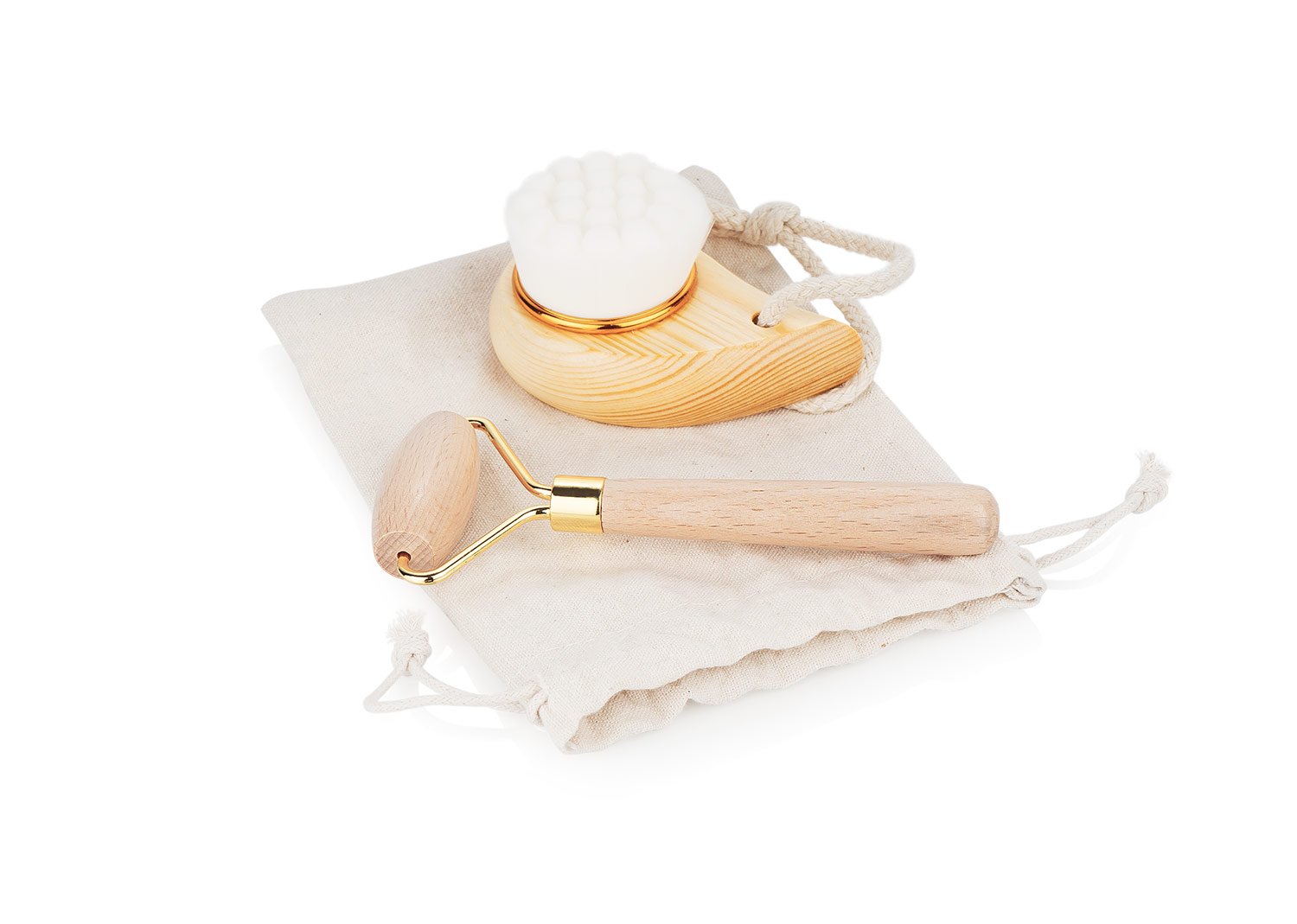 Kit para el cuidado facial que estimula la microcirculación y mejora la apariencia de la piel, reduciendo la aspecto de los ojos cansados. Incluye un rodillo de madera, un cepillo facial ultra suave y una bolsa de algodón que resulta práctica para guardar y transportar.