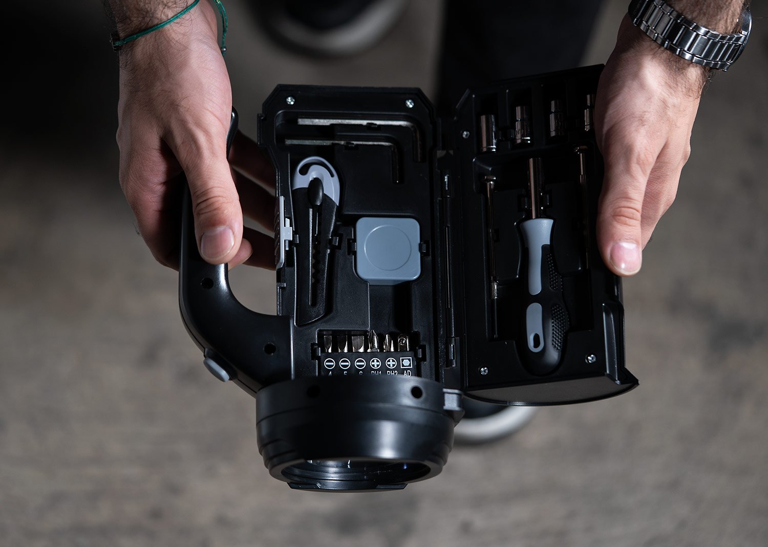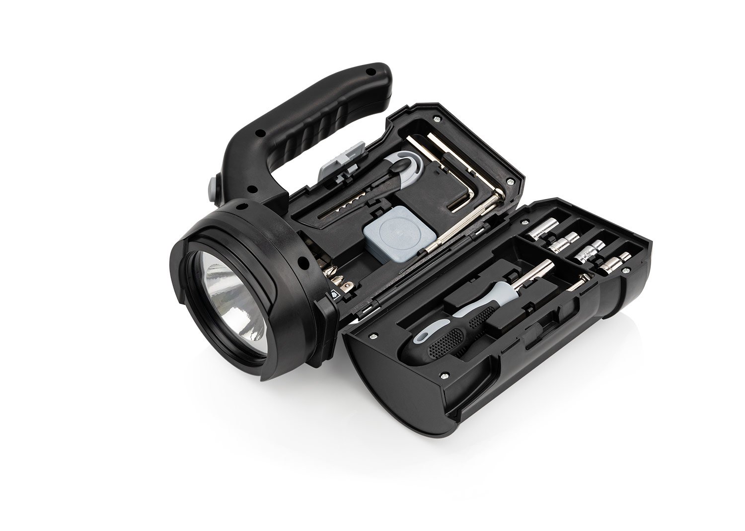 Caja de herramientas con linterna LED externa (3 pilas AA no incluidas). Incluye 4 copas estándar, 6 puntas de destornillador, 2 destornilladores de precisión, un portapuntas magnético, 1 bisturí, 2 llaves hexagonales y 1 cinta métrica de 1 metro (39 pulgadas).