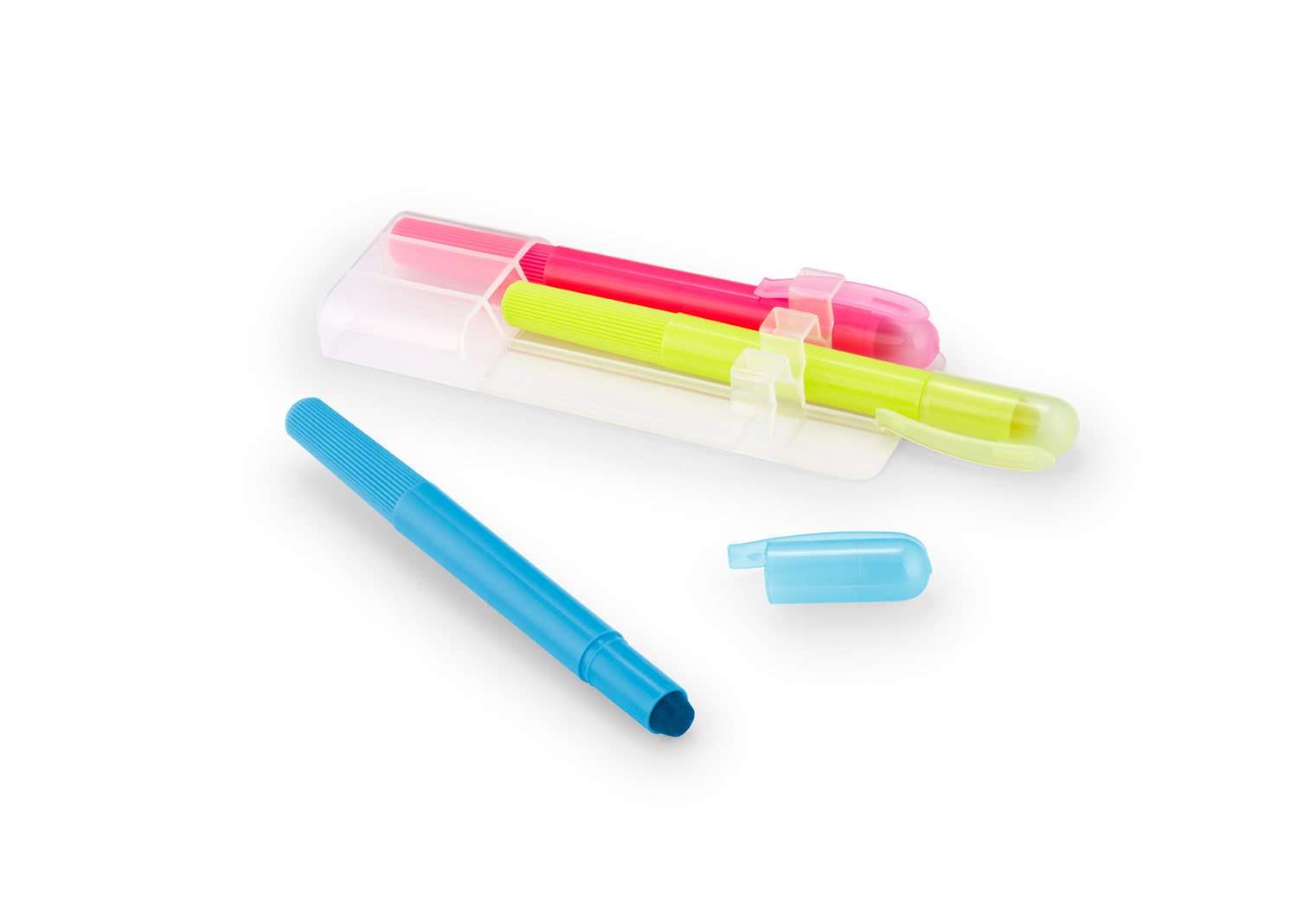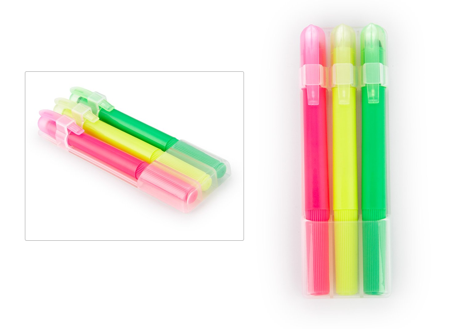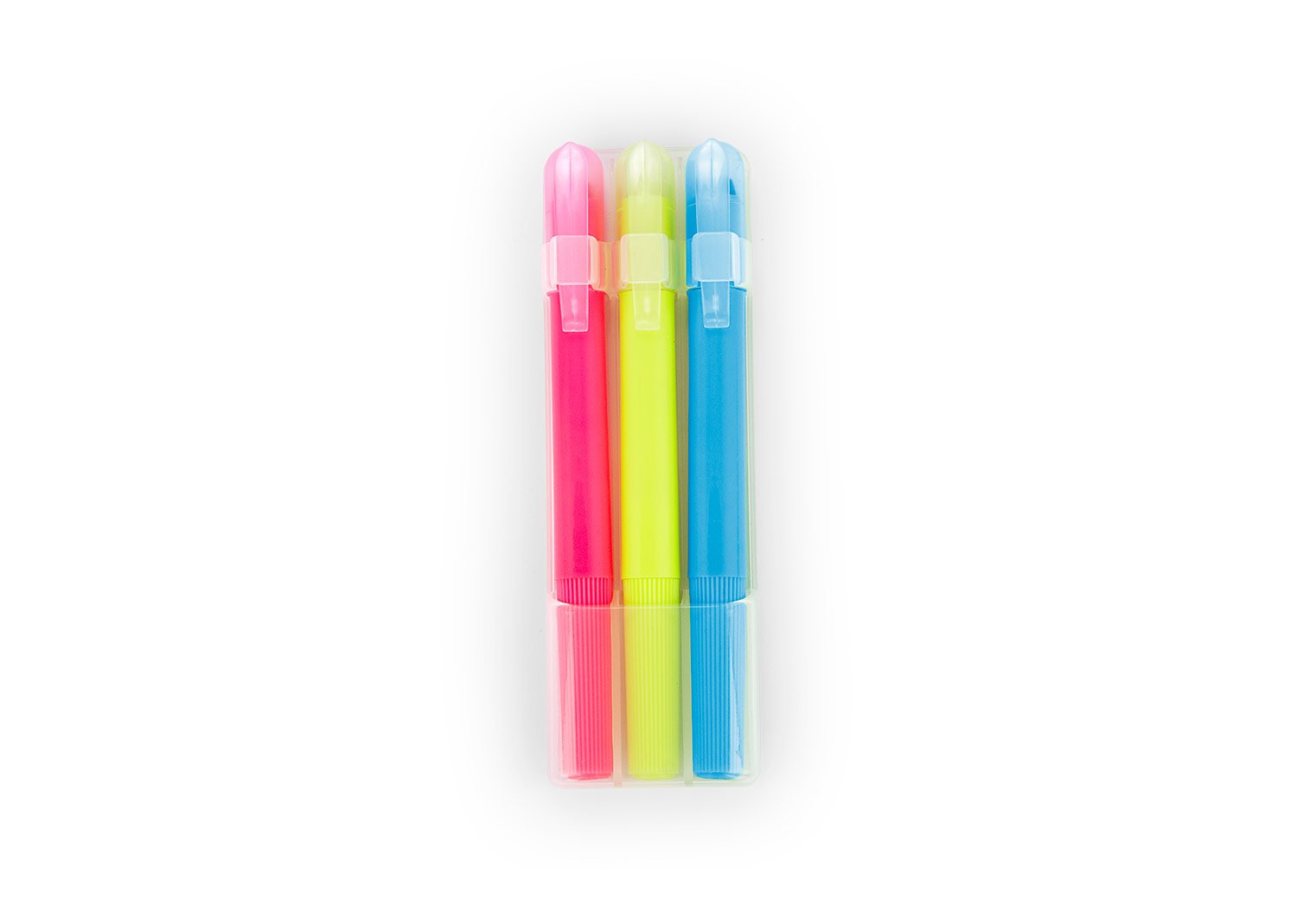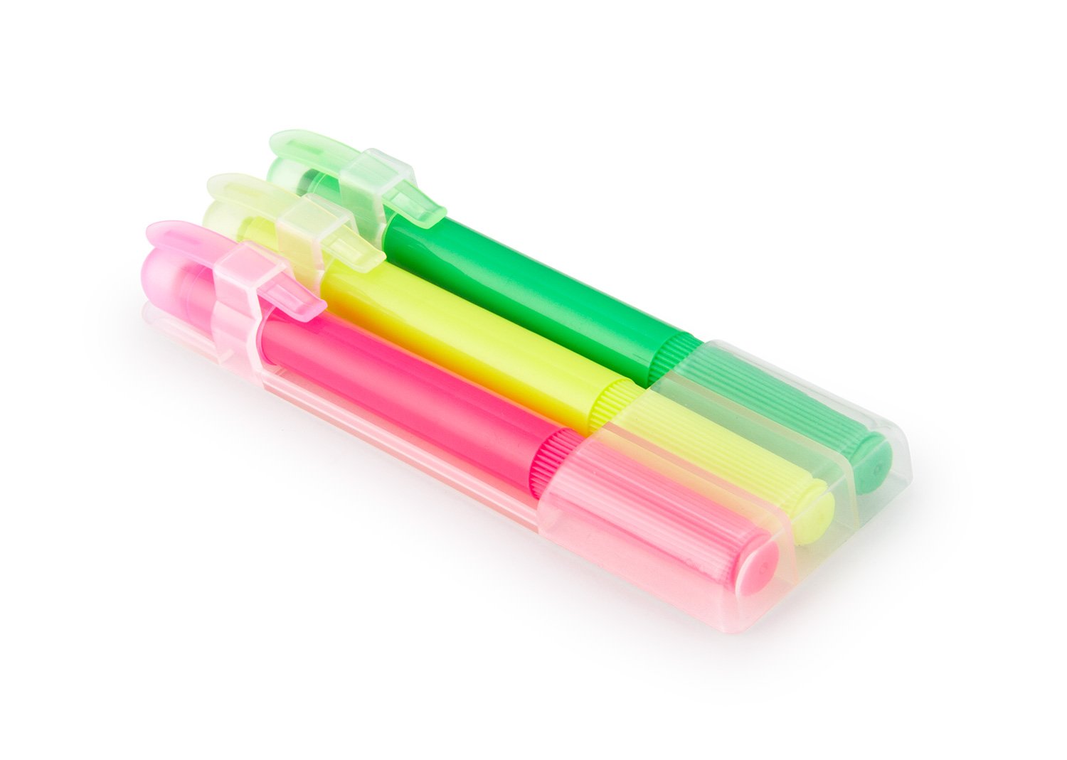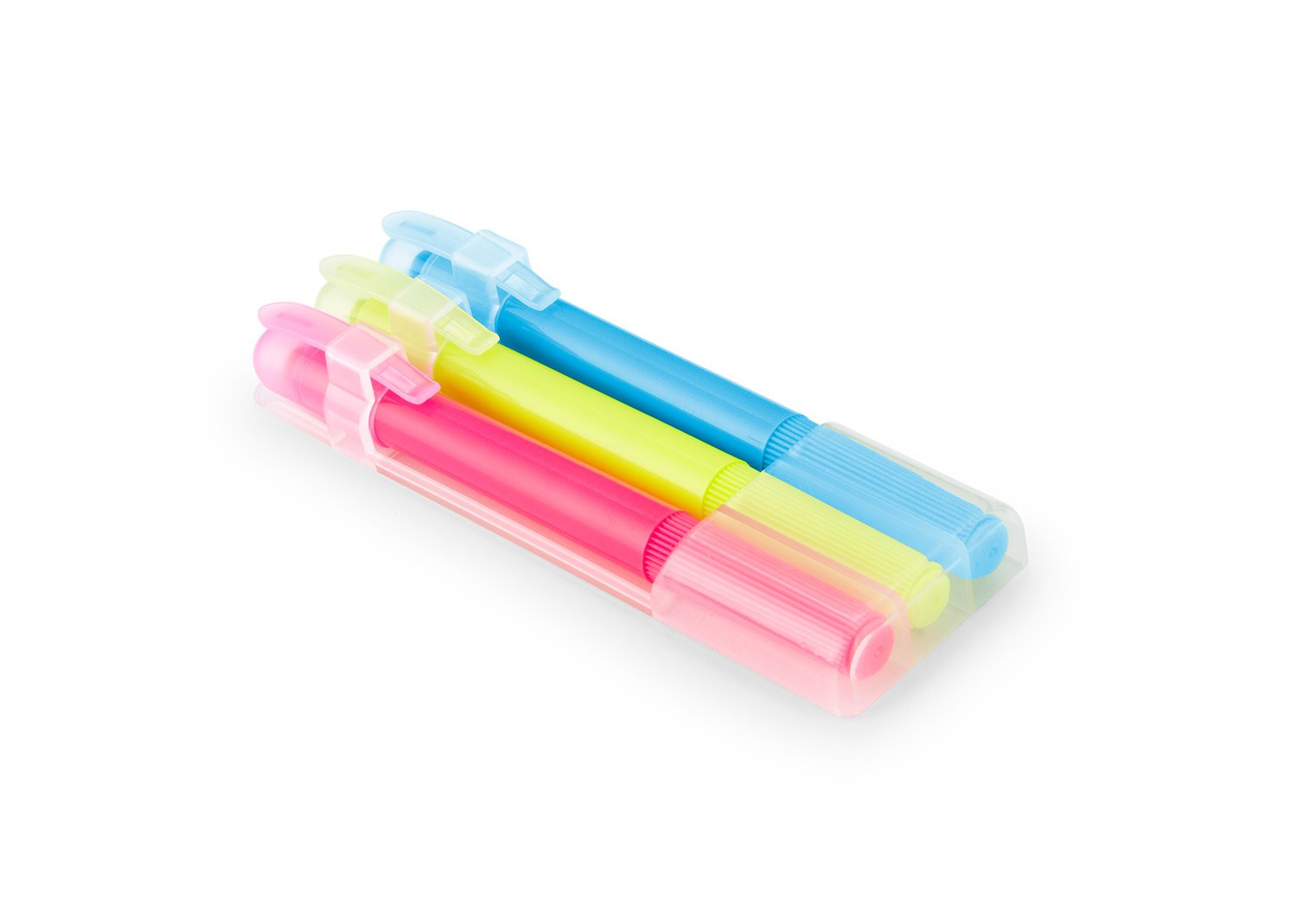 Set de 3 resaltadores en parafina. No se seca. Con tapa y clip. Sistema Twist.