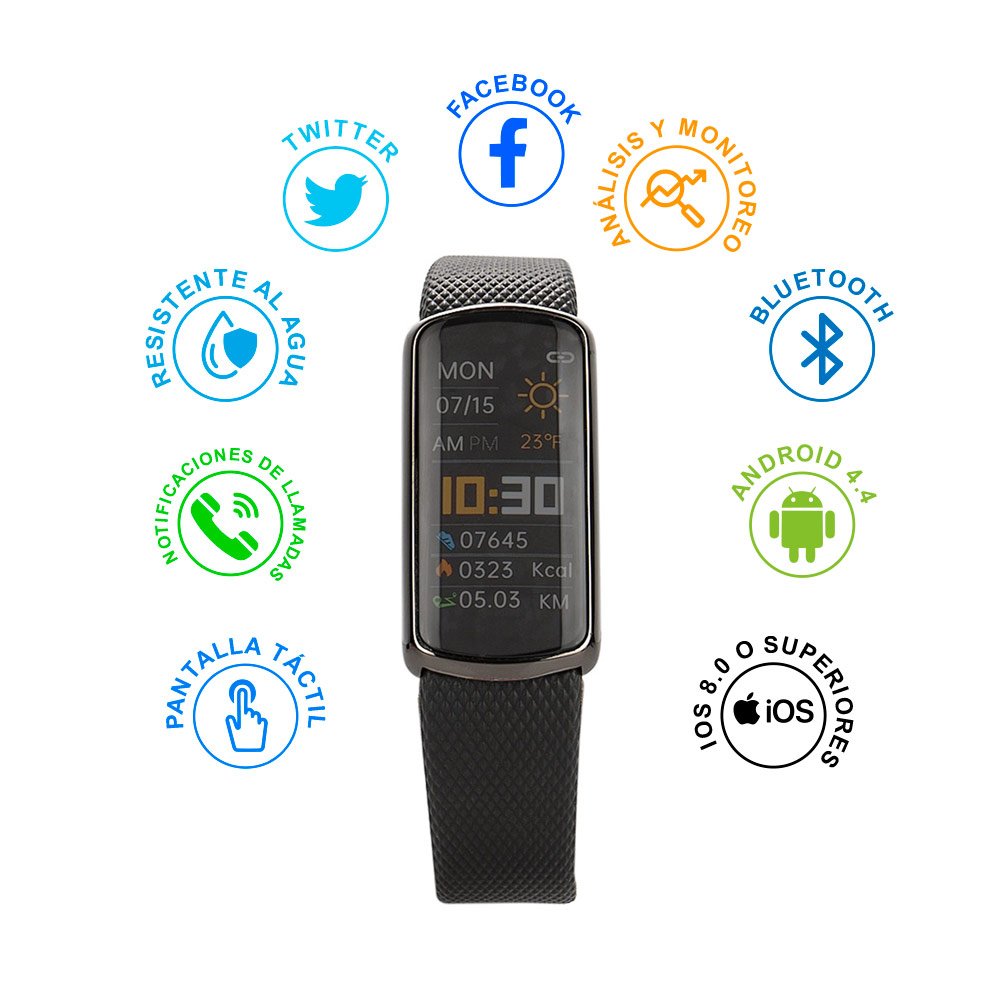 Reloj inteligente con pantalla táctil de 0,96″ TFT color. Análisis y monitoreo del número de pasos, calorías, distancia, horas de sueño, medición de oxígeno, frecuencia cardíaca y presión arterial. Notificaciones de llamadas, WeChat, QQ, Facebook, Twitter. Resistente al agua (nivel IP68). Incluye cronómetro, temporizador y reloj. Bluetooth 5.2. Compatible con sistemas operativos Android 4.4 y iOS 8.0 o superiores.