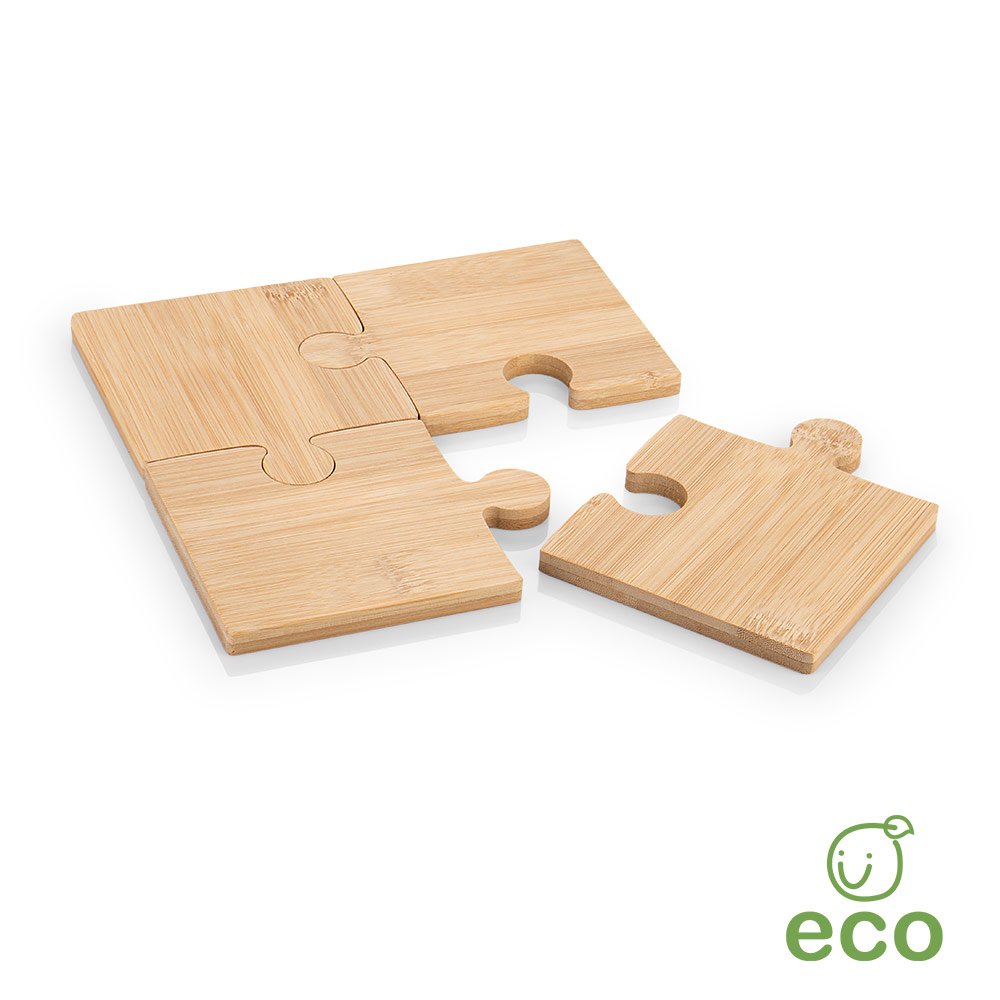 Prácticos portavasos en Bambú y forma de puzle, que al unir se puede usar como tabla de Picar.